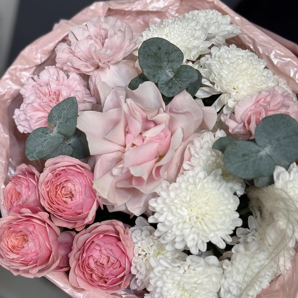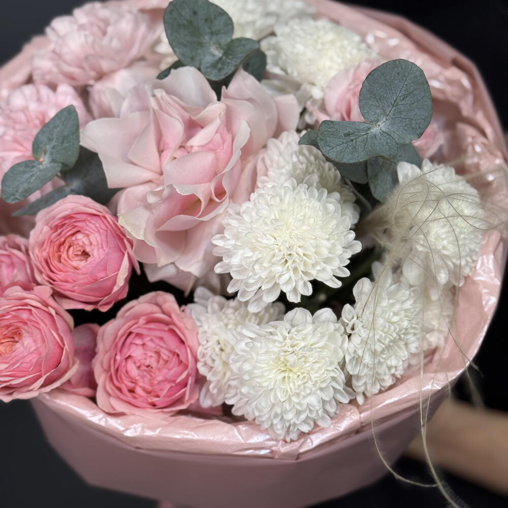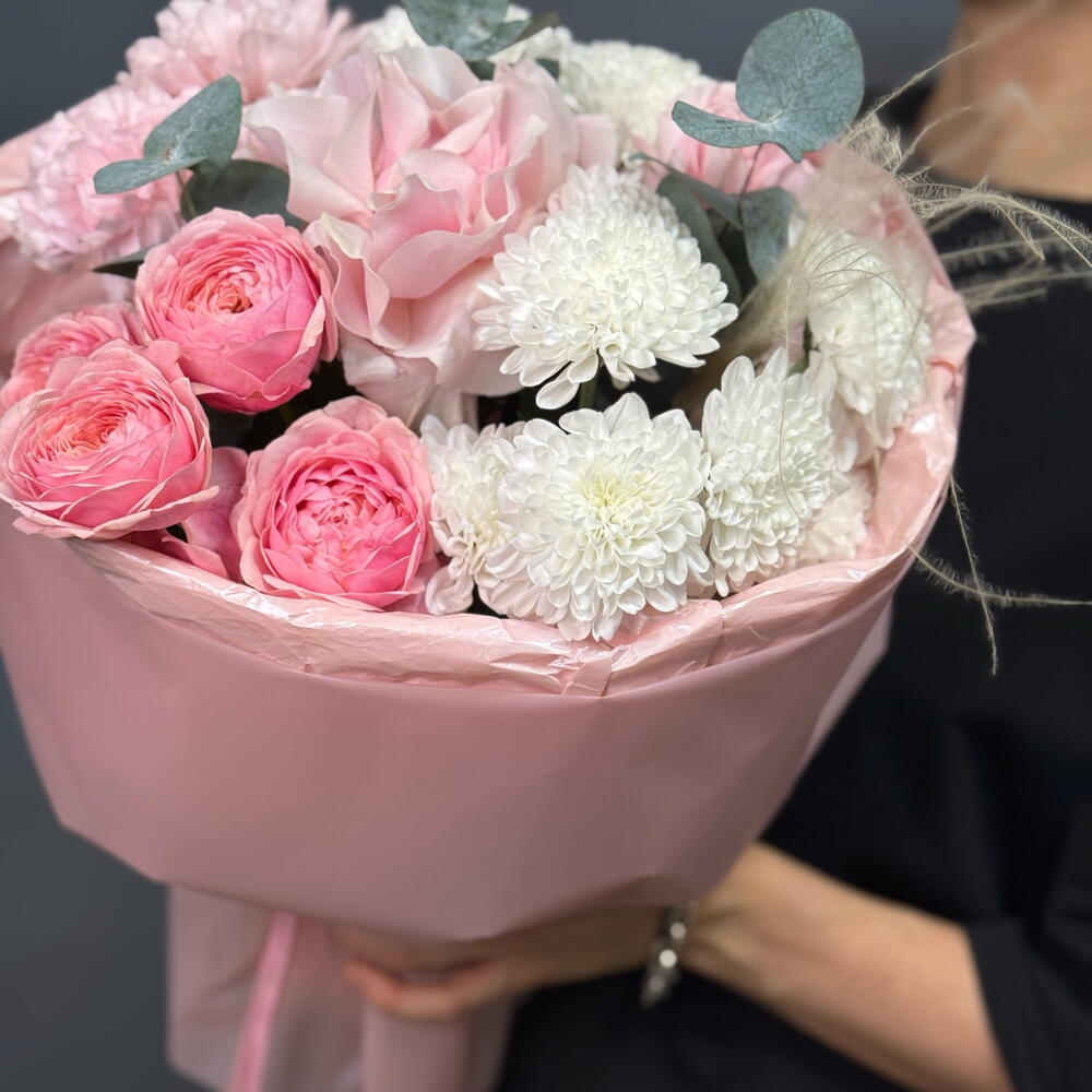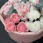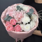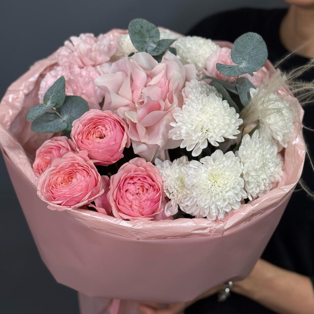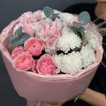 Хризантема кустовая - 2 шт. Диантус - 3 шт. Упаковка дизайнерская - 1 шт. Французская роза - 1 шт. Пионовидная кустовая роза - 1 шт. Эвкалипт Микс - 3 шт. Стифа - 1 шт.