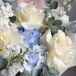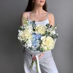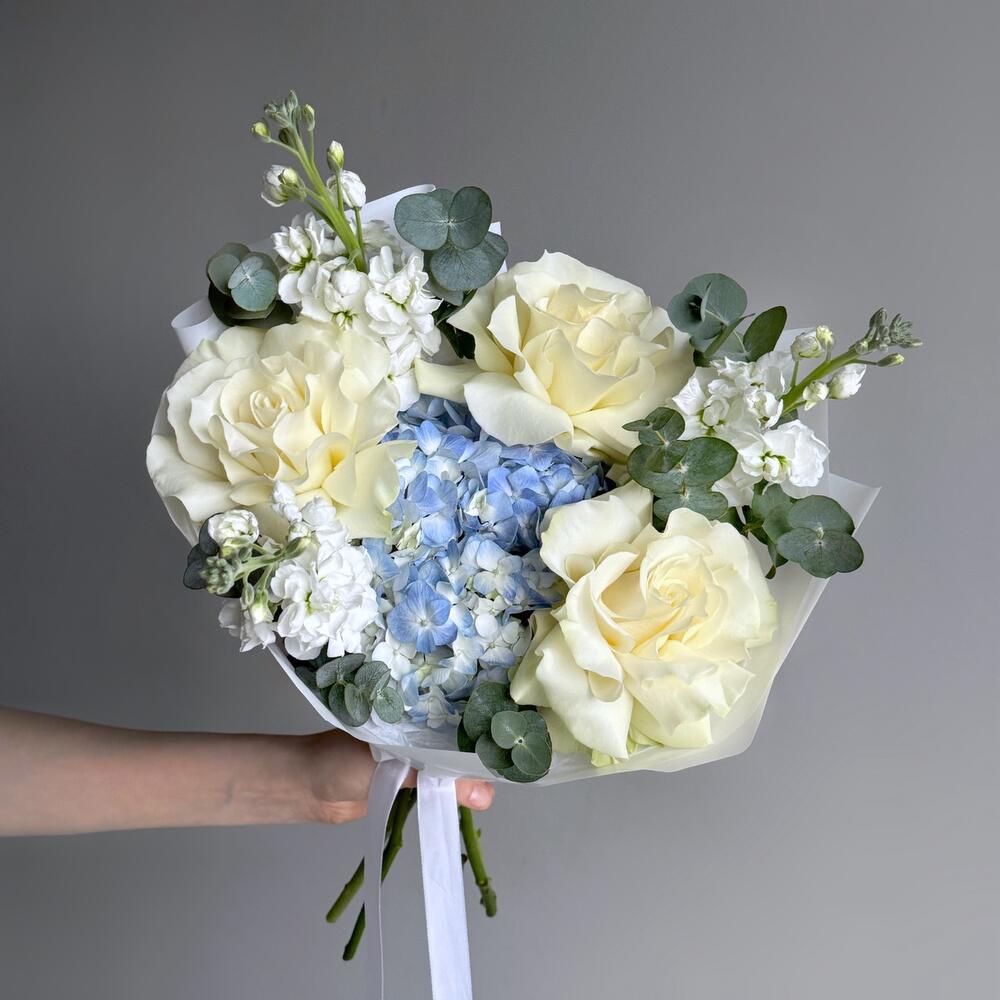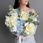 Букет в белых и голубых тонах с французской розой сорта Мондиаль. За счет маттиолы букет обладает легким ненавязчивым ароматом :) Не забудьте подрезать цветы НЕПОСРЕДСТВЕННО перед тем как ставить в вазу (после подрезки в течении 2-3 секунд поставьте в воду). Не храните букет на прямых солнечных лучах и возле отопительных приборов, чтобы сохранить цветы свежими как можно дольше. Обратите внимание на размеры букета и фото в полный рост с человеком, для понимания размера композиции, это фото есть в карточке товара :)