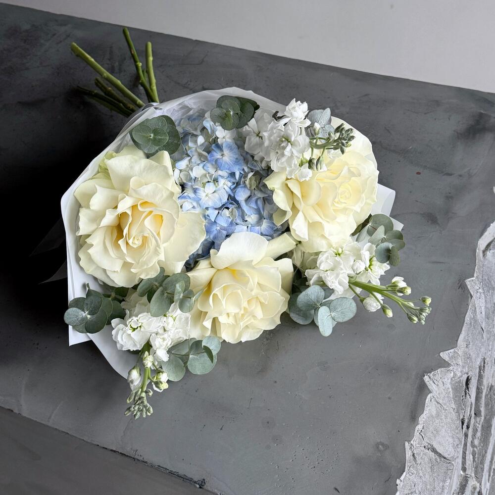 Букет французская роза Мондиаль, голубая гортензия, маттиола и эвкалипт