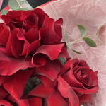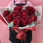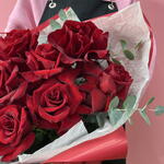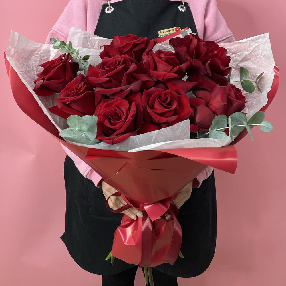 Лента - 2 шт. Роза красная - 9 шт. Эвкалипт - 3 шт. Упаковка дизайнерская - 2 шт.