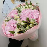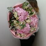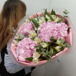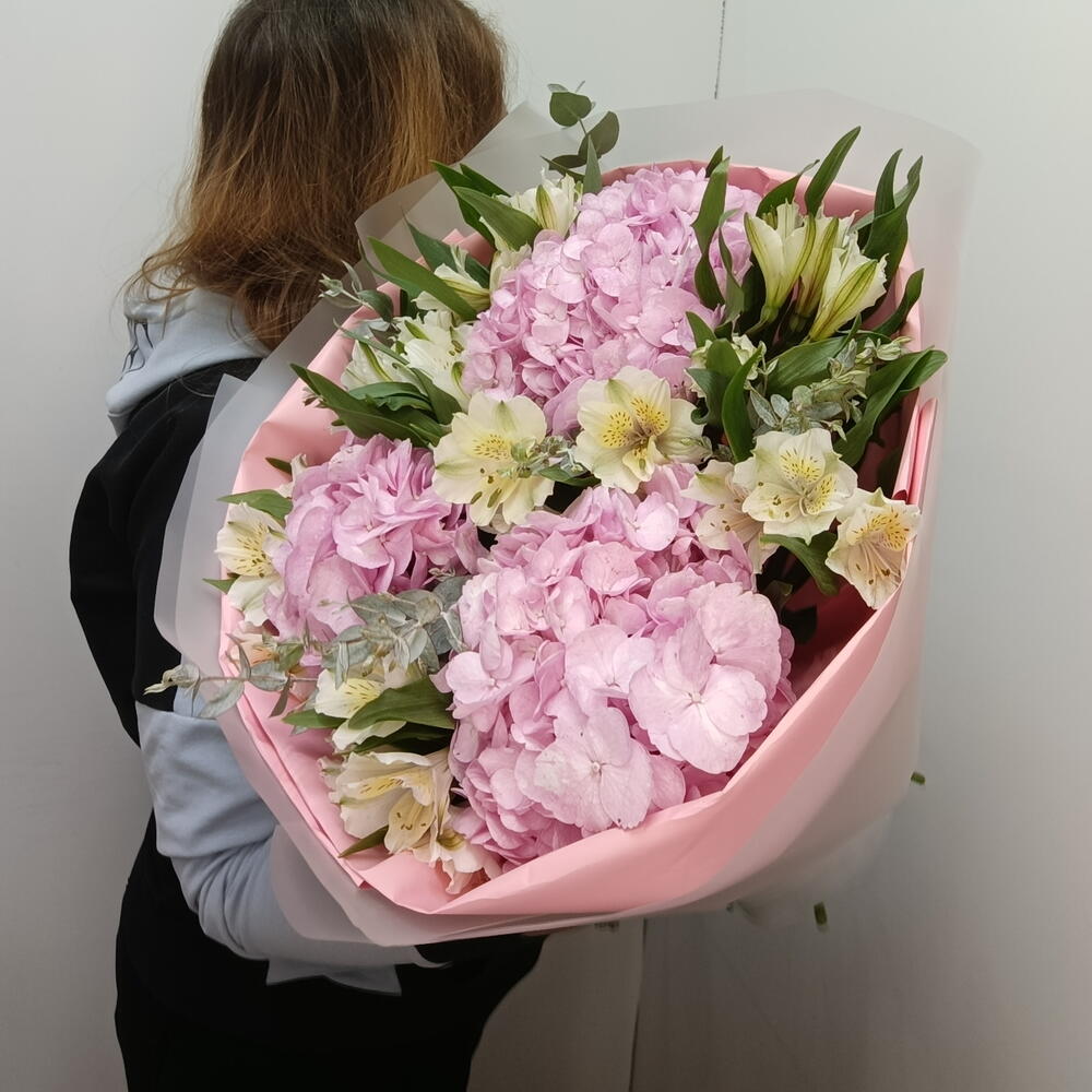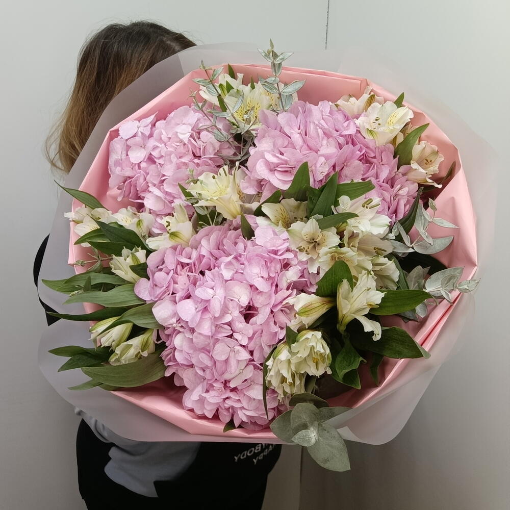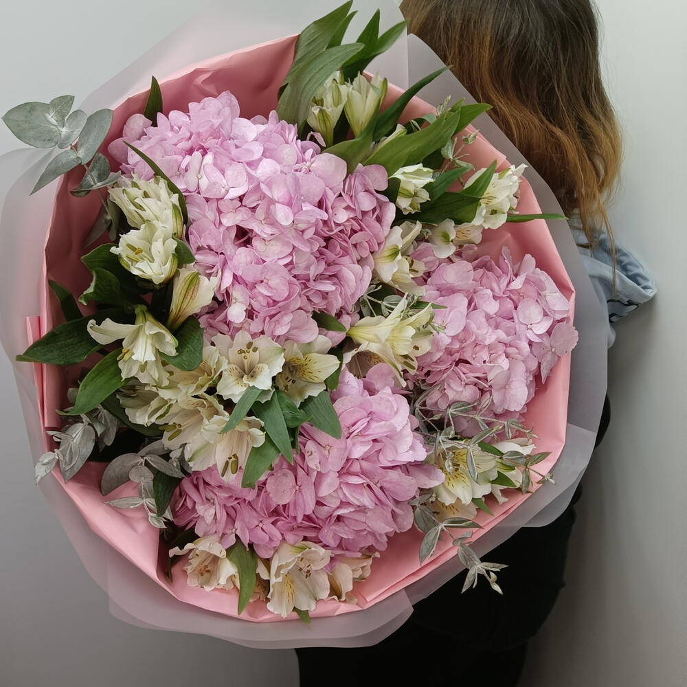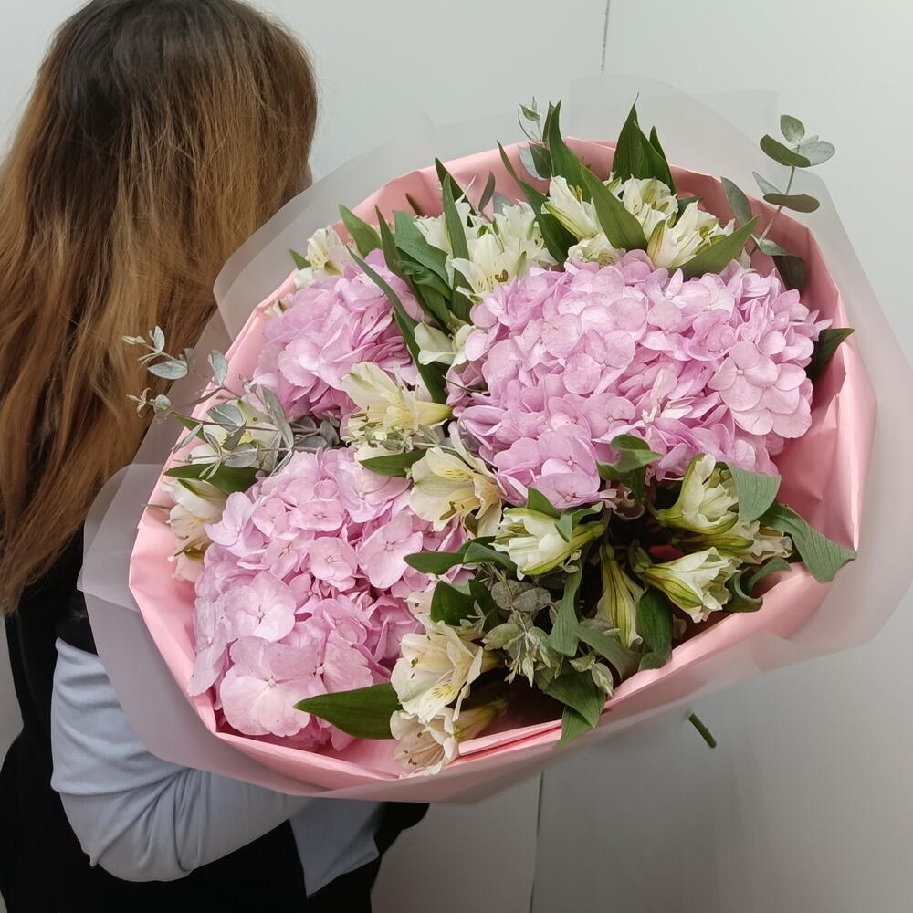 Альстромерия - 7 шт. Гортензия - 3 шт. Лента атласная - 1 шт. Упаковка дизайнерская - 6 шт. Эвкалипт Цинерея - 7 шт.