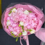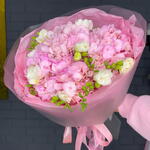 Гортензия - 3 шт. Атласная лента - 3 шт. белая фрезия - 8 шт. Дизайнерская упаковка - 2 шт.