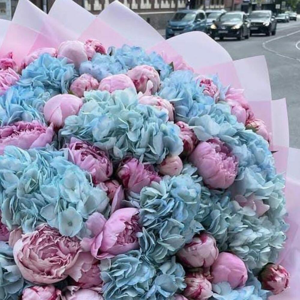 Гортензия - 18 шт. Лента атласная - 1 шт. Открытка - 1 шт. Упаковка дизайнерская - 1 шт. пионы - 41 шт. отличное настроение - 1000 шт.