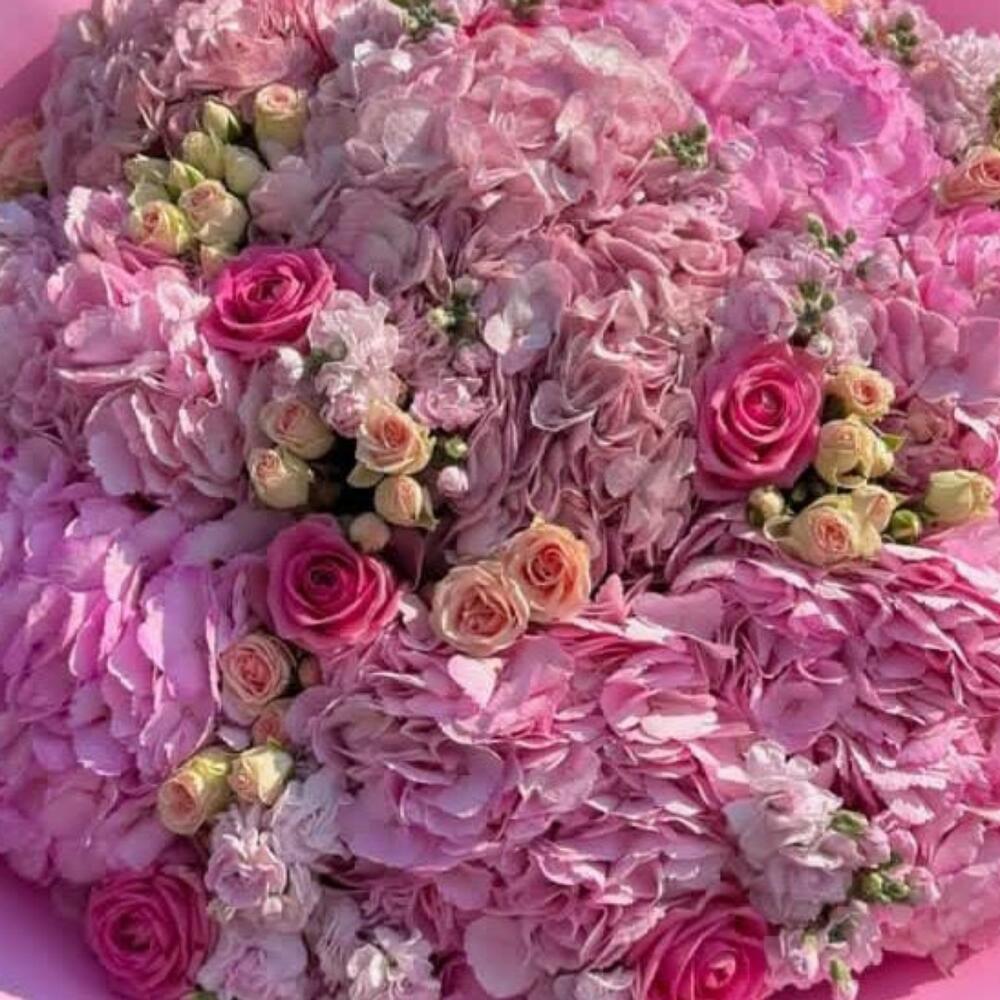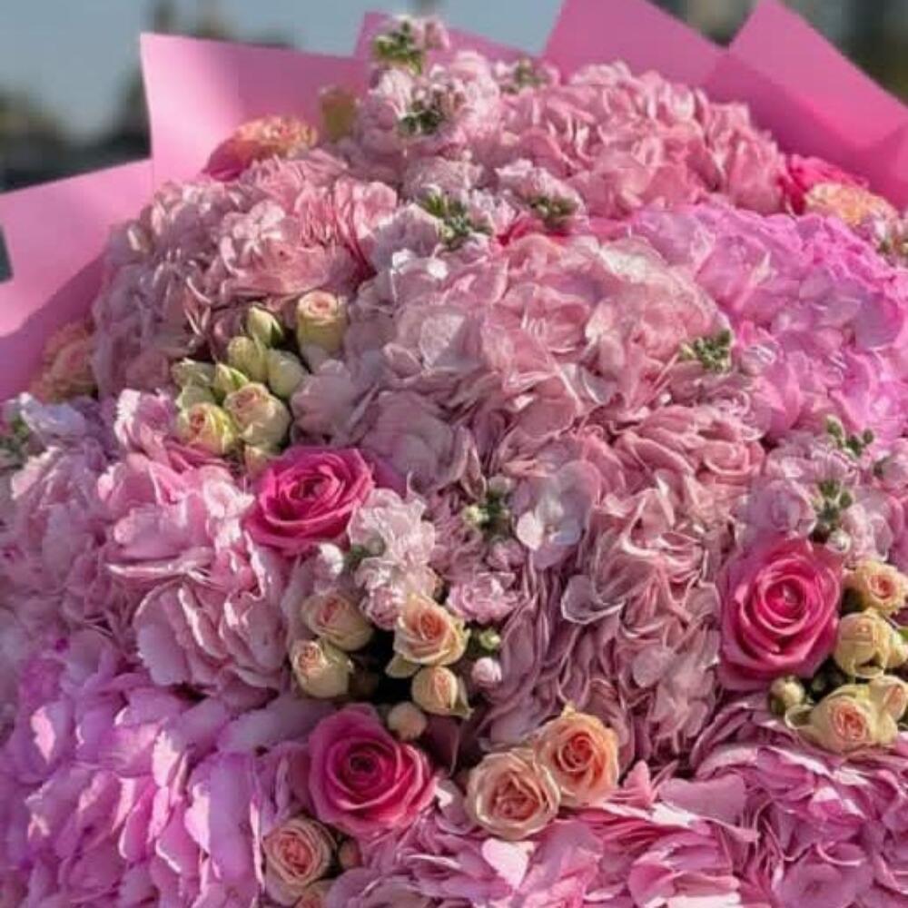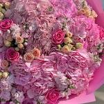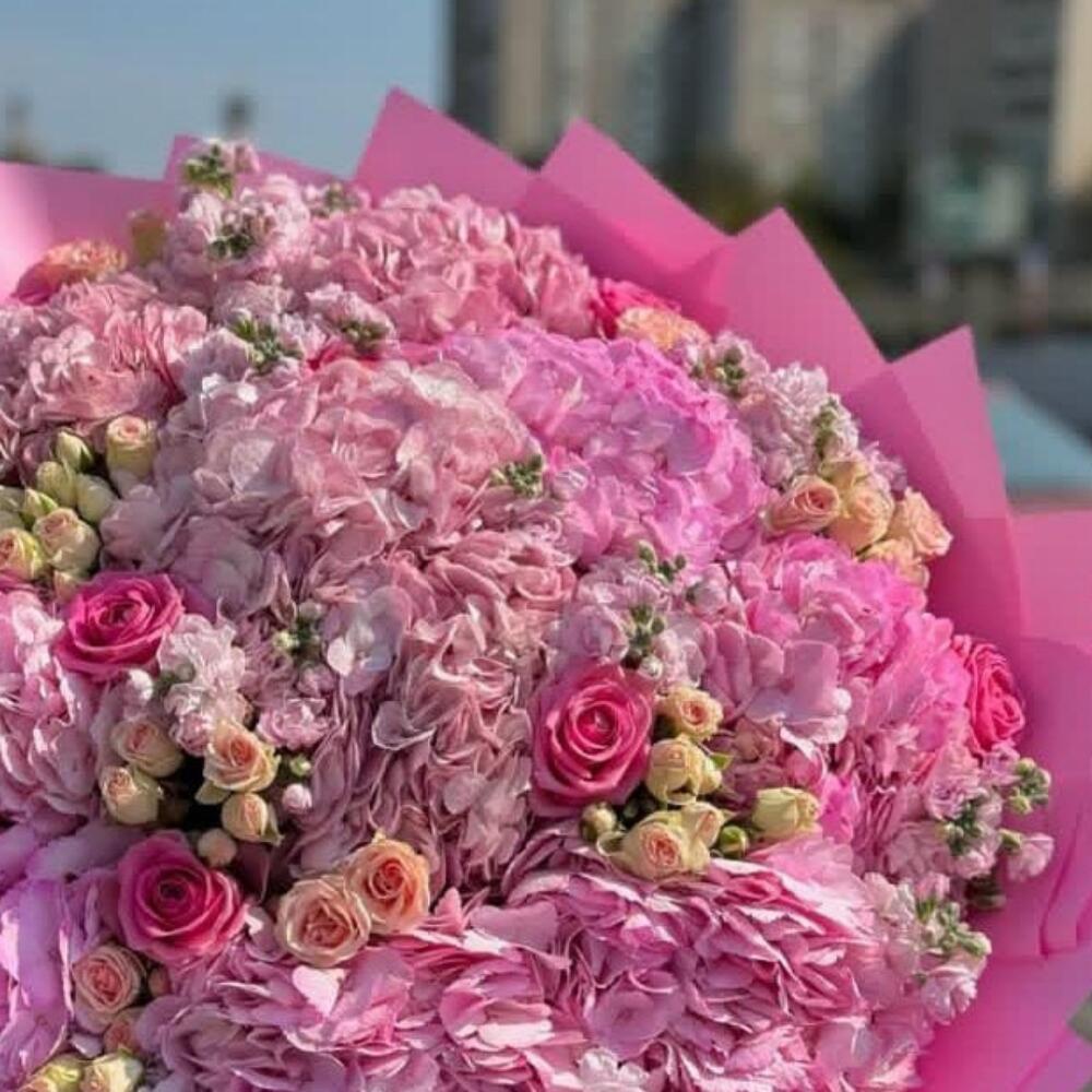 Гортензия - 10 шт. Маттиола - 20 шт. Лента атласная - 1 шт. Упаковка дизайнерская - 1 шт. Открыточка с вашими пожеланиями - 1 шт. розы кустовые - 10 шт. розы одноголовые - 10 шт. отличное настроение - 1000 шт.