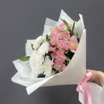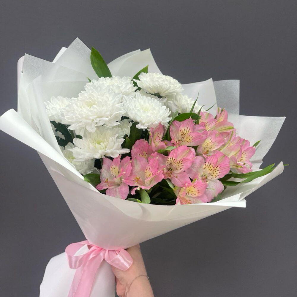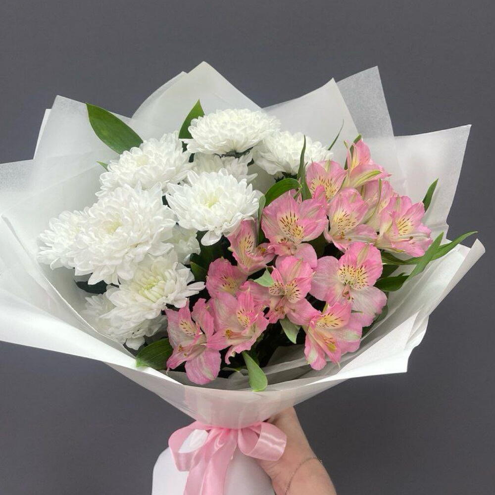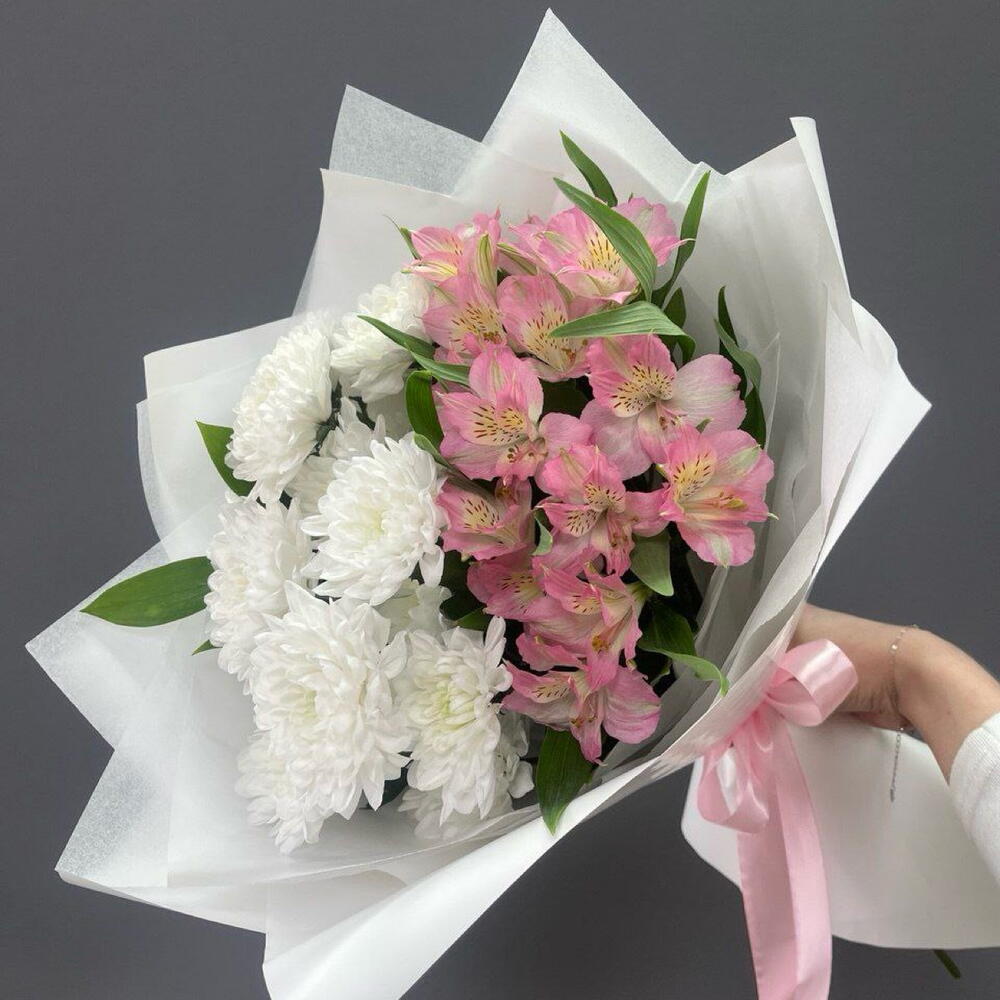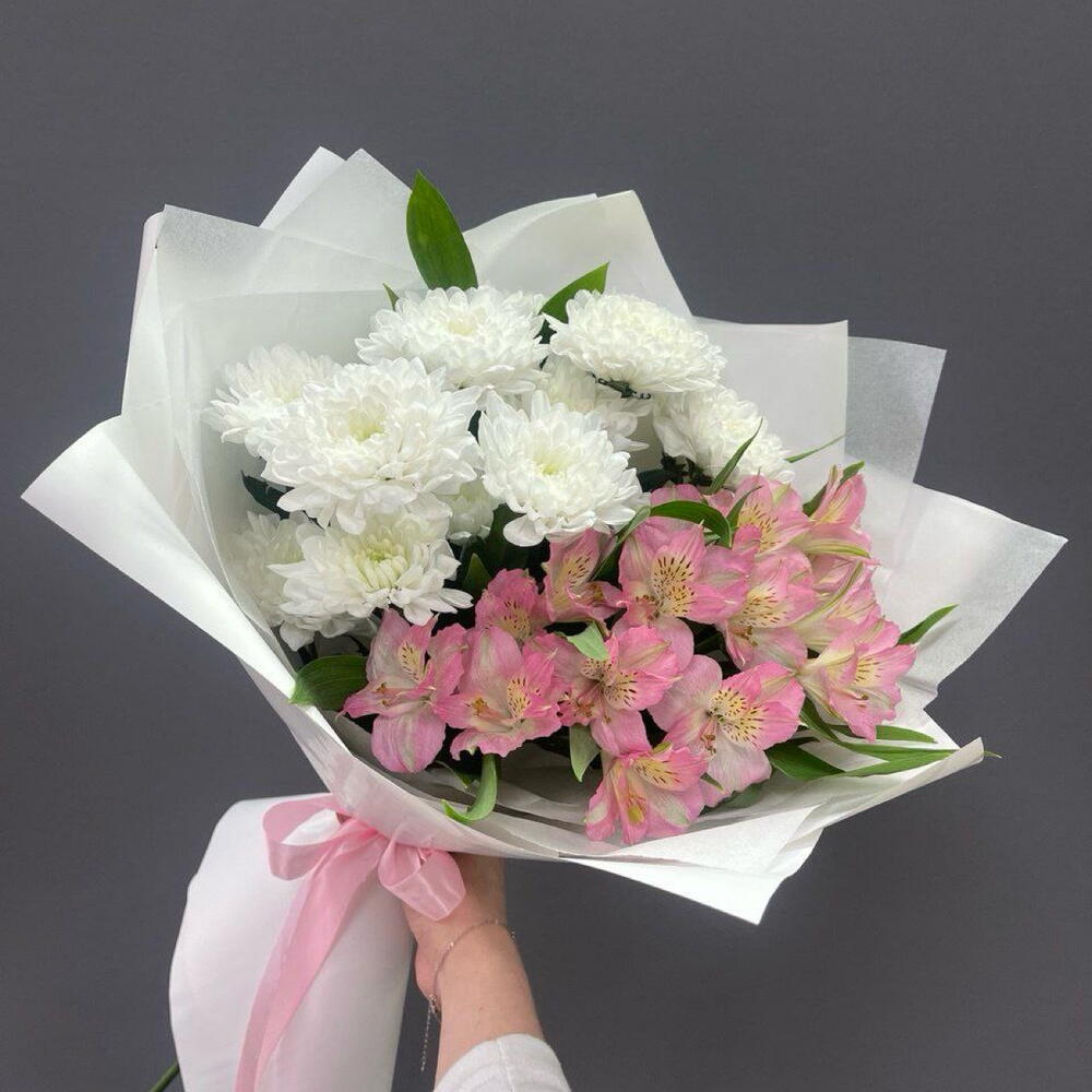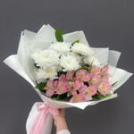 Альстромерия - 6 шт. Хризантема кустовая - 3 шт. Лента атласная - 2 шт. Упаковка дизайнерская - 3 шт.