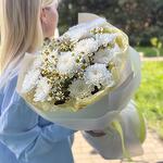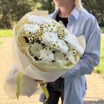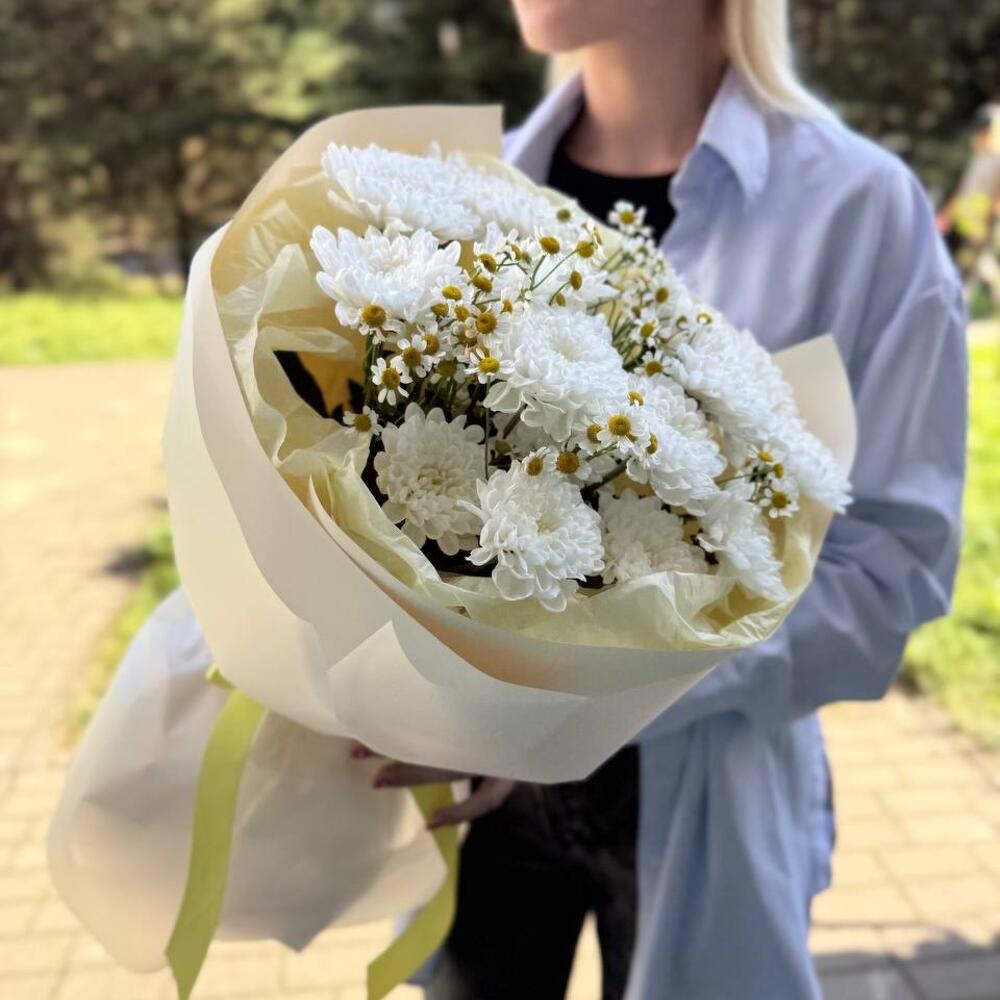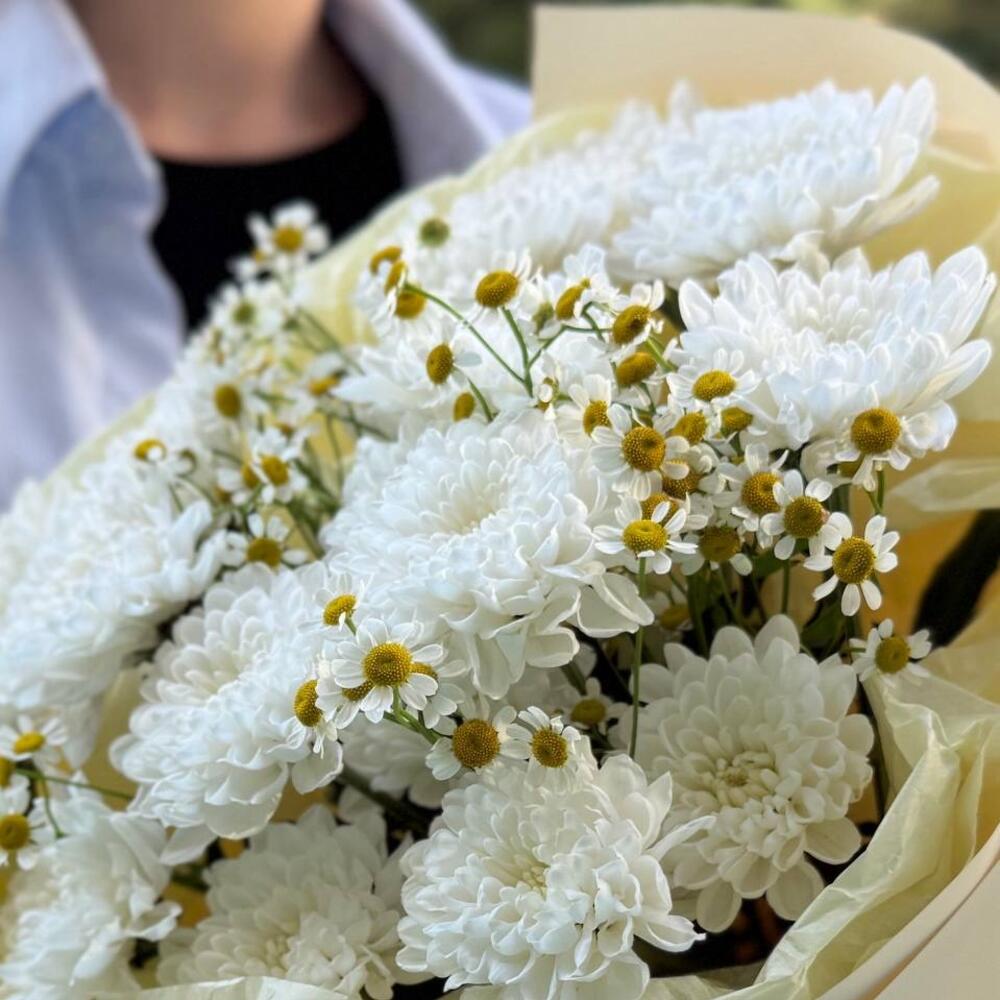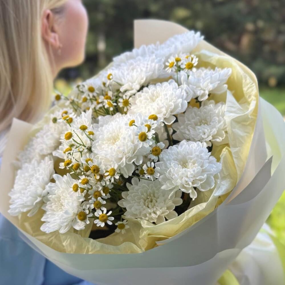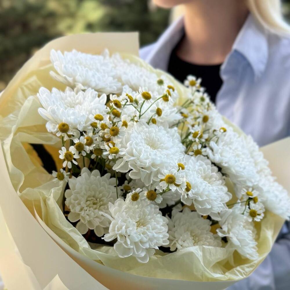 Букет кустовой хризантемы с ромашкой. Нежный и воздушный букет из пушистых кустовых хризантем белоснежного оттенка. Их дополняют изящные соцветия ромашки, придающие композиции объем, графичность и легкую степную романтику. Сочетание нежности и фактурности создает образ чистой, искренней и долговечной красоты. Идеально для нежного признания