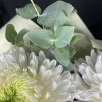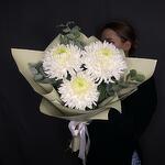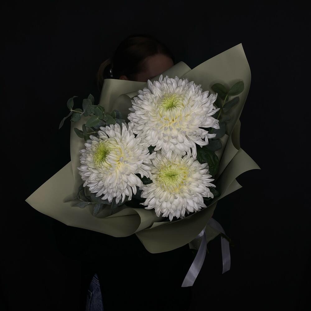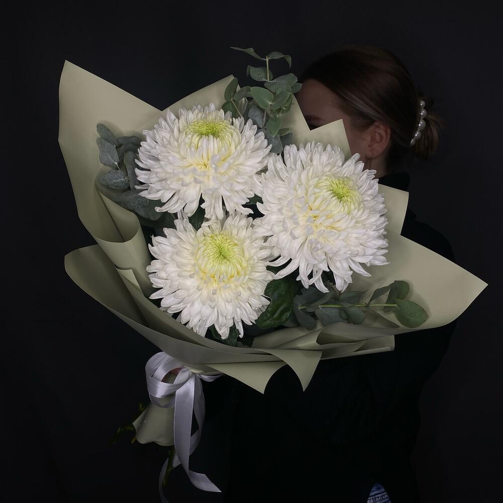 Эвкалипт - 3 шт. Лента атласная - 1 шт. Хризантема одноголовая - 3 шт. Пленка дизайнерская - 2 шт.