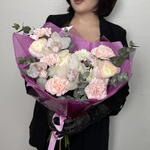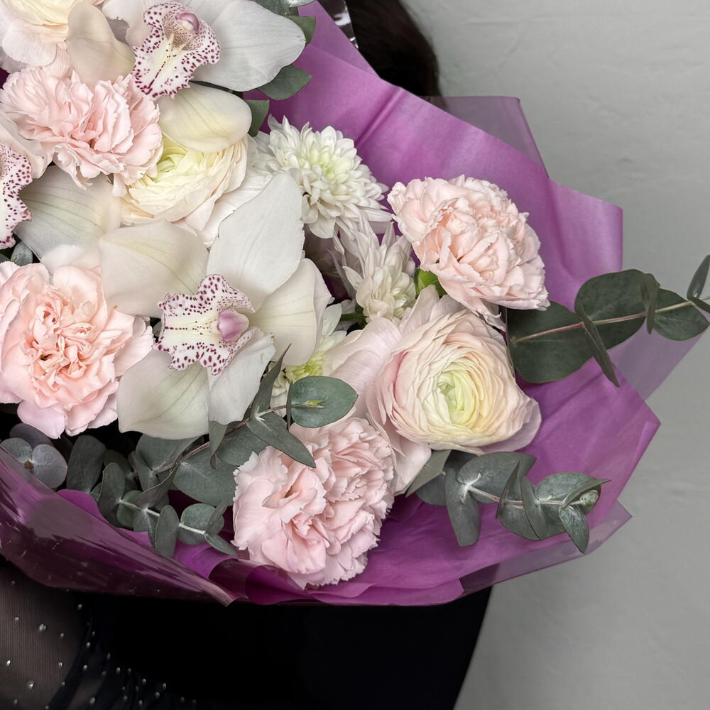 Хризантема кустовая - 1 шт. Эвкалипт - 1 шт. Орхидеи - 3 шт. диантусы сортовые - 5 шт. Ранункулус - 3 шт.