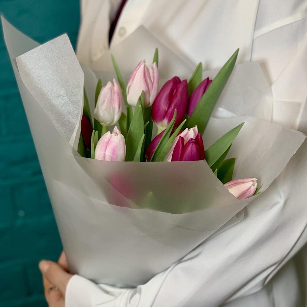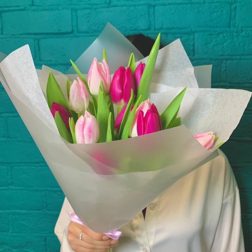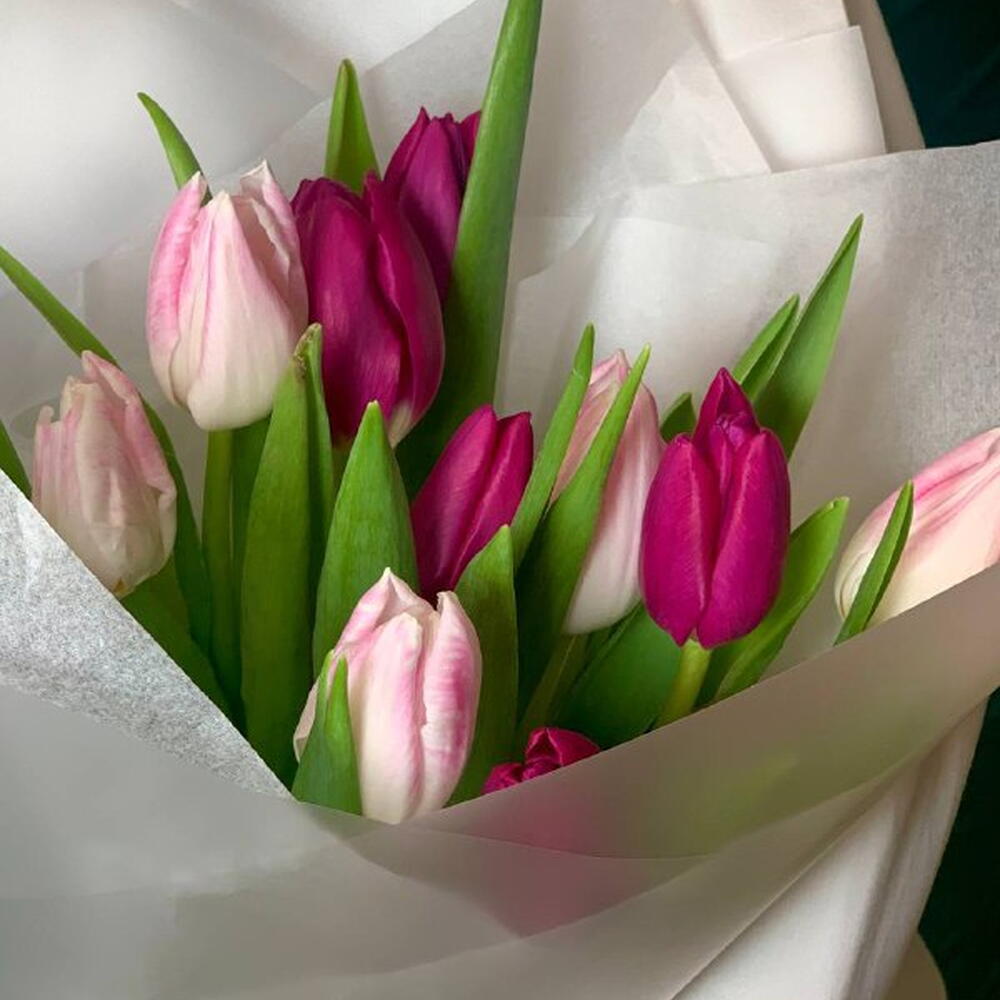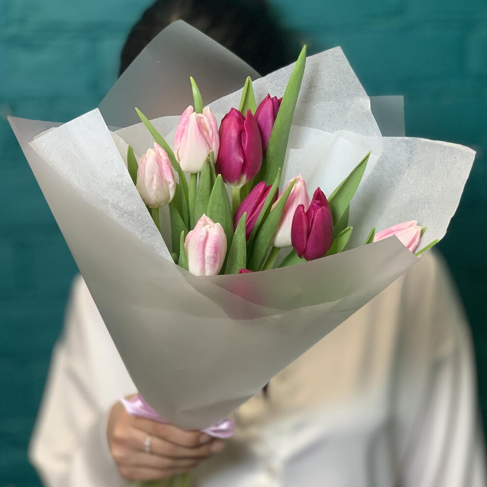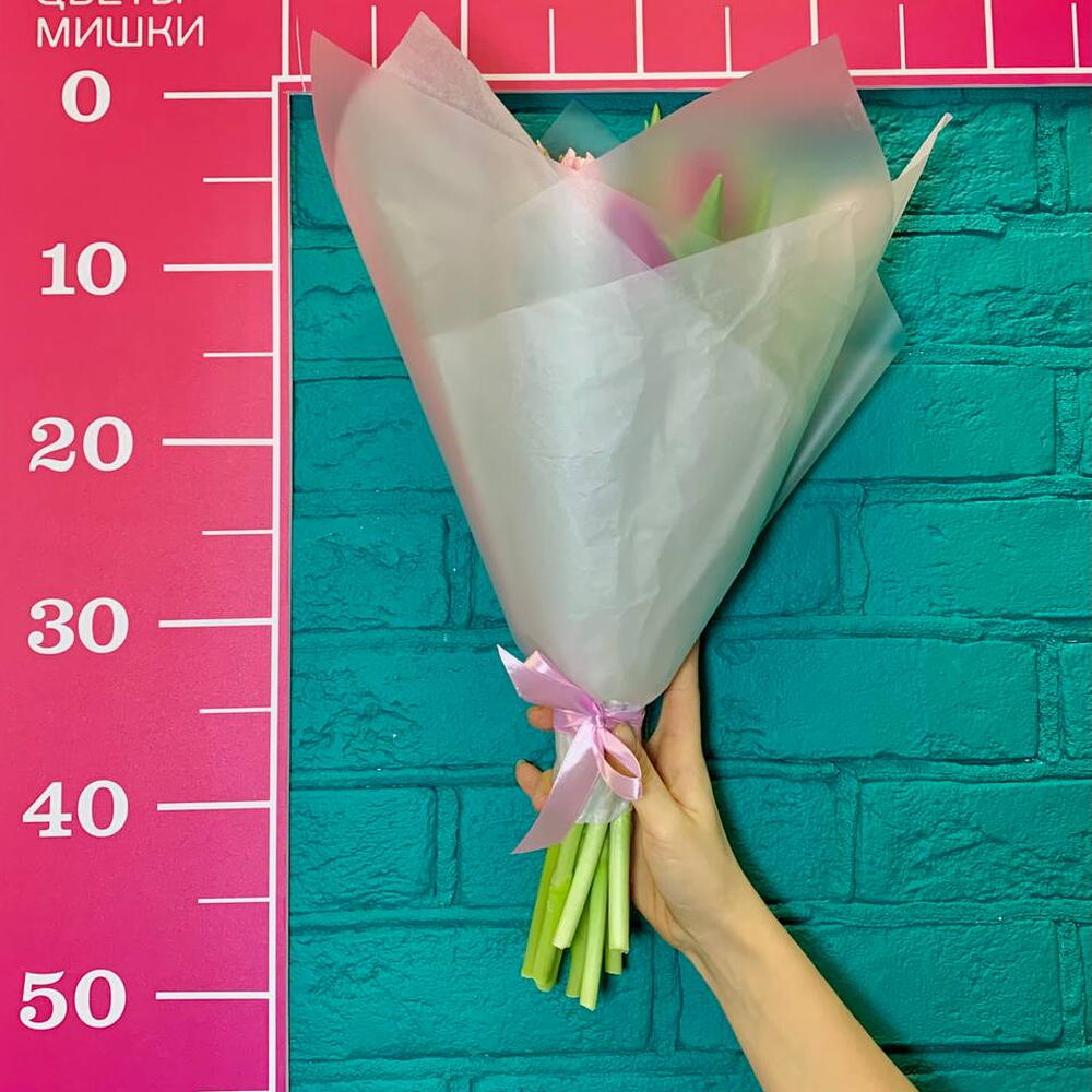 Тюльпан - 11 шт. Бумага тишью - 1 шт. пленка флористическая - 1 шт. технические материалы - 1 шт.