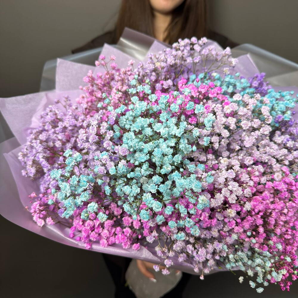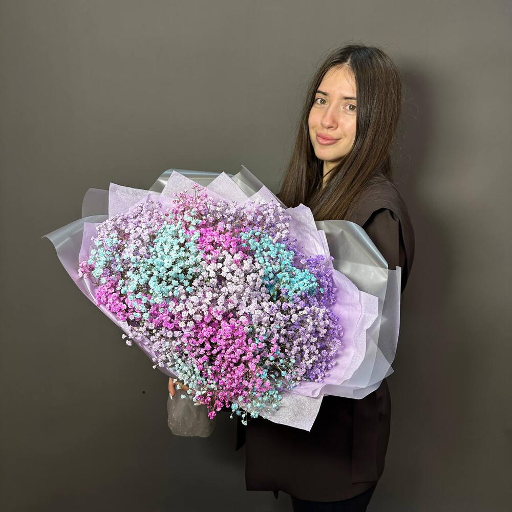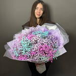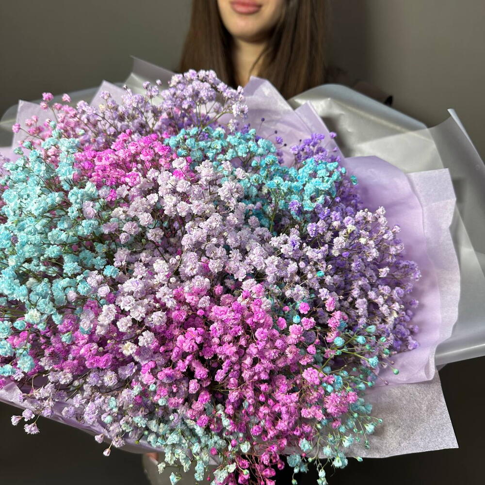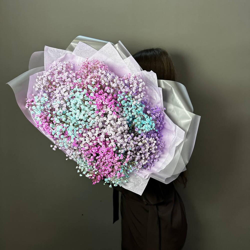 Букет из радужной гипсофилы – это настоящий калейдоскоп радости и волшебства, где привычная воздушная легкость этих миниатюрных цветов преображается благодаря палитре ярких, переливающихся оттенков. Каждый крошечный бутончик словно окрашен в свой уникальный цвет – от нежных пастельных до насыщенных неоновых, создавая впечатляющее зрелище, будто сотни крошечных радуг собрались в одном объеме. Эта необычная композиция излучает энергию веселья и беззаботности, привносит нотки фантазии и оригинальности, делая букет идеальным подарком для тех, кто ценит креативность и стремится подарить не просто цветы, а целое красочное настроение, напоминающее о летнем дожде и сияющей радуге.