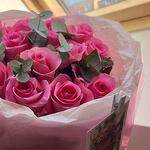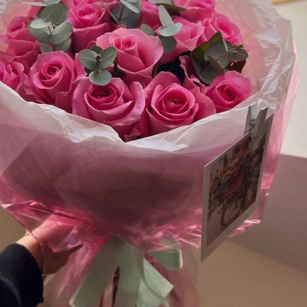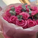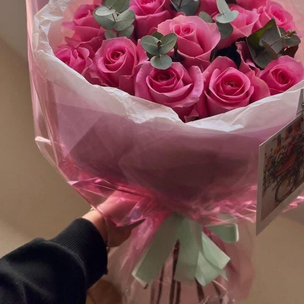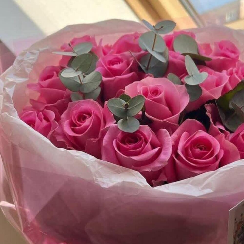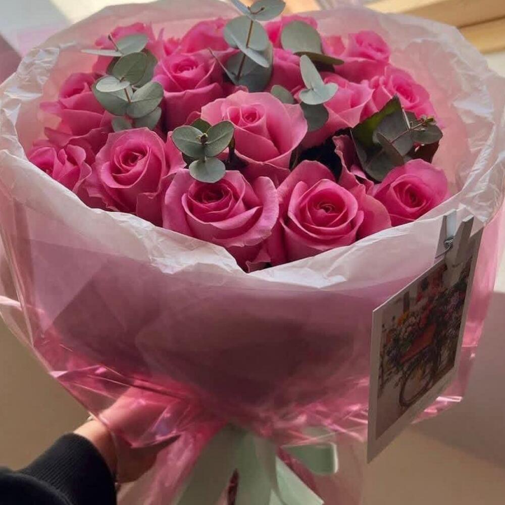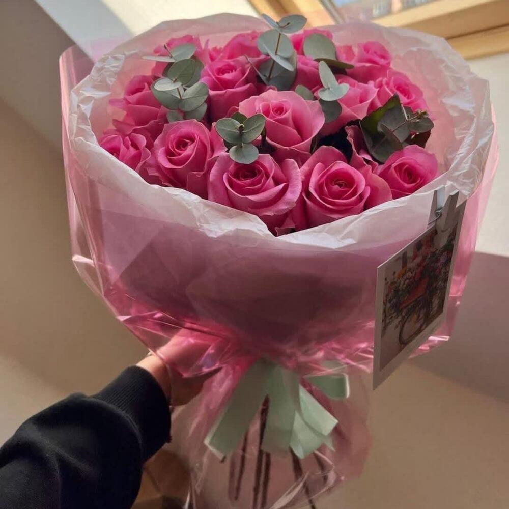 Эвкалипт - 7 шт. Роза - 15 шт. Лента атласная - 1 шт. Упаковка дизайнерская - 1 шт. Открыточка с вашими пожеланиями - 1 шт. отличное настроение - 1000 шт.