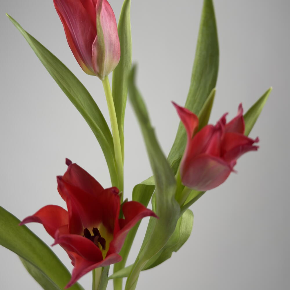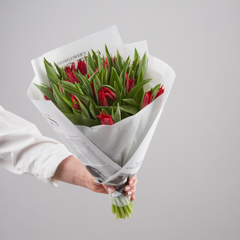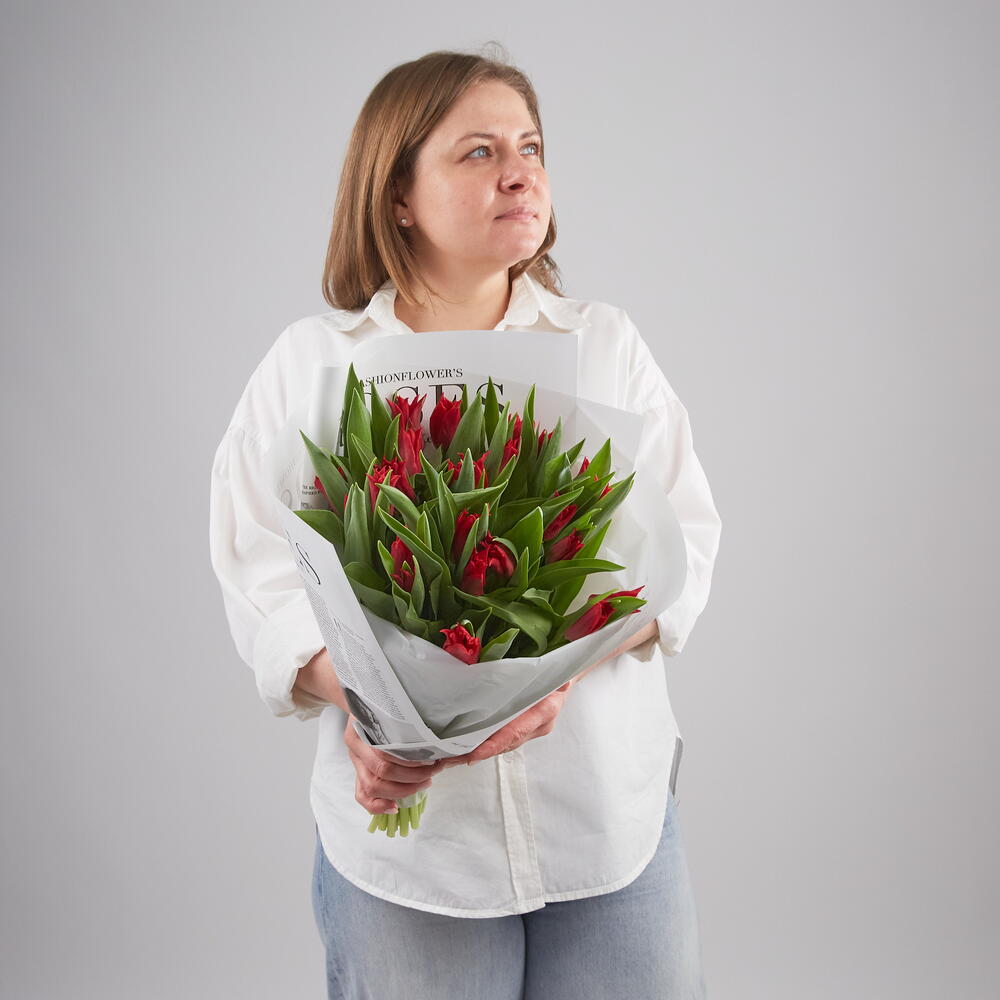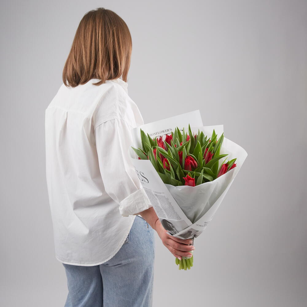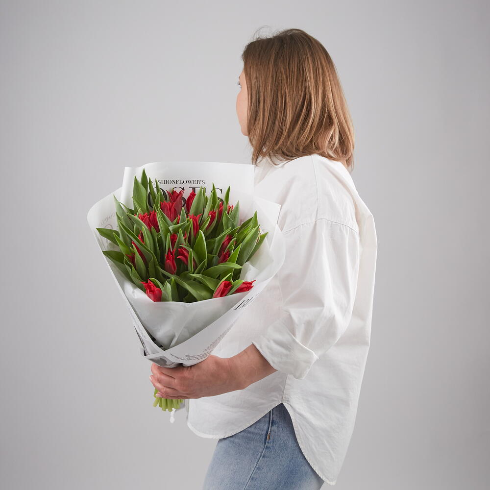 Букет из 19 красных тюльпанов Претти Вумен. Тюльпан раскрывается изящным колокольчиком.