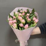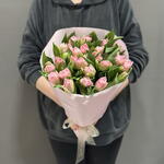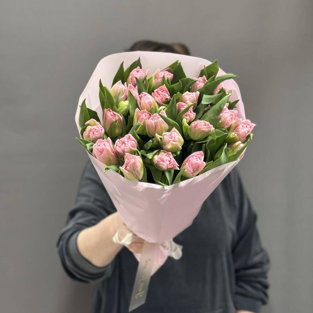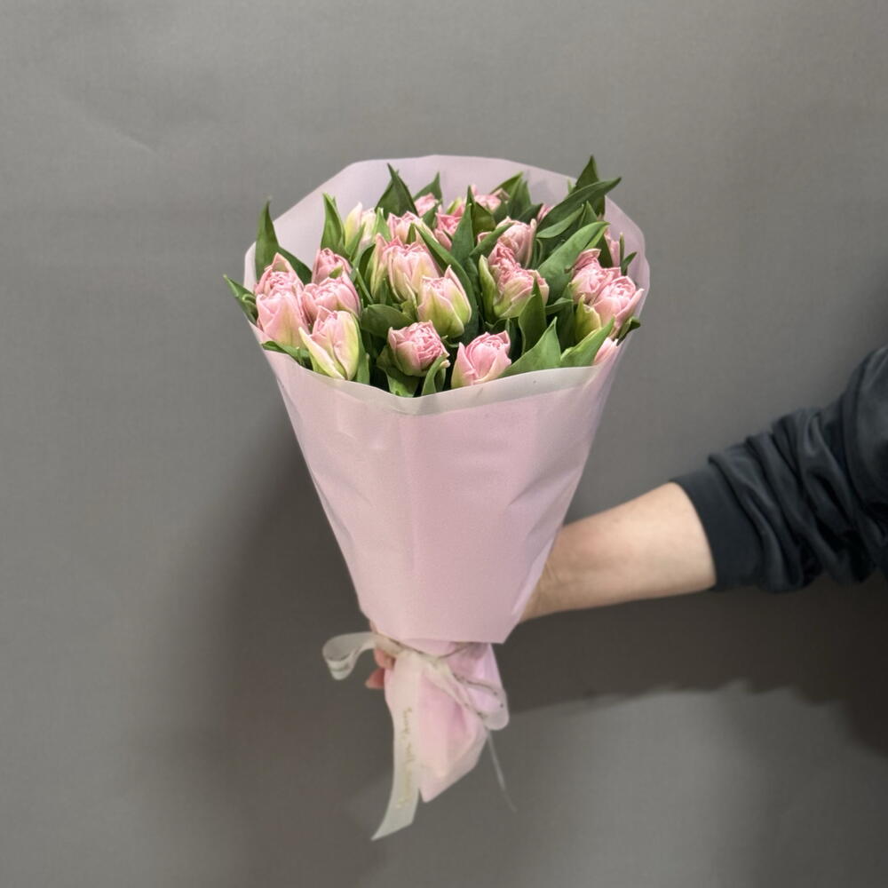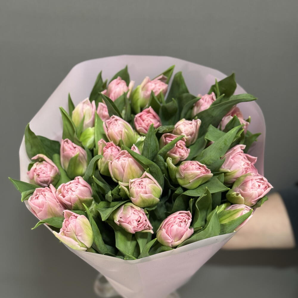 Нежный весенний букет из розовых пионовидных тюльпанов, собранный в аккуратную плотную композицию. Бутоны мягкого розового оттенка с легкими кремовыми переливами создают ощущение воздушности и романтики, а сочная зелень подчеркивает свежесть цветов. Букет оформлен в матовую розовую упаковку и перевязан изящной лентой, что придаёт ему утончённый и подарочный вид. Идеально подойдёт для признания в чувствах, нежного комплимента, дня рождения или просто чтобы порадовать близкого человека 🌸