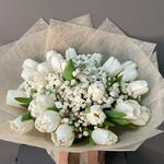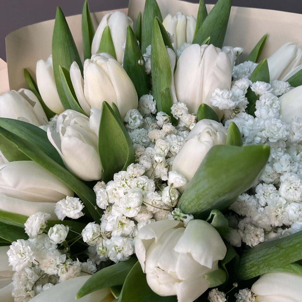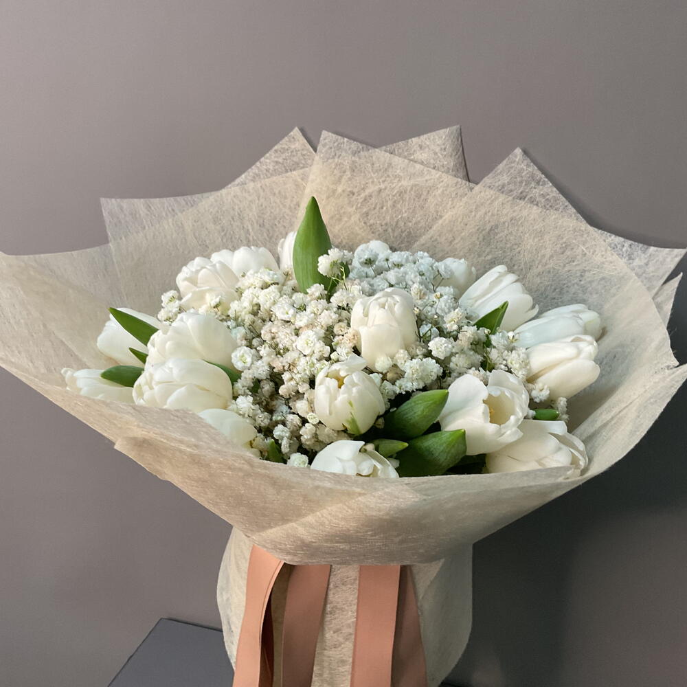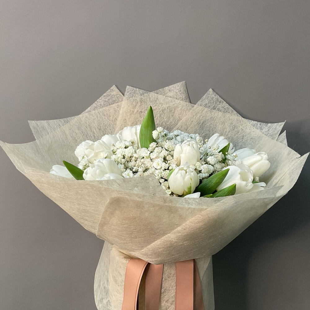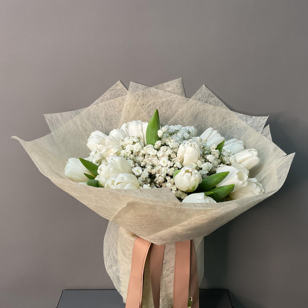 Лента атласная - 5 шт. Пленка дизайнерская - 10 шт. Гипсофила Белая - 11 шт. тюльпаны - 23 шт. любовь флориста (бесплатно) - 7 шт.
