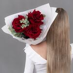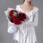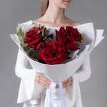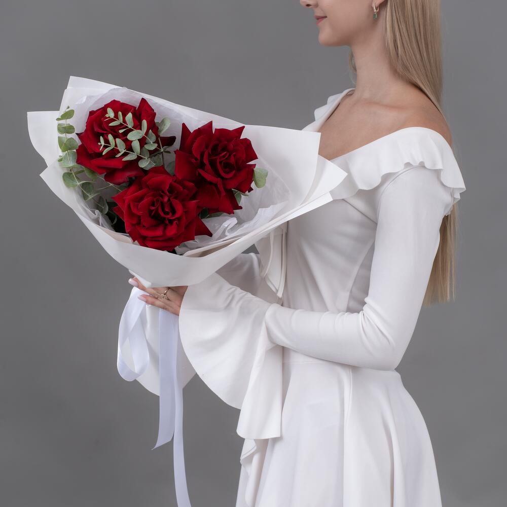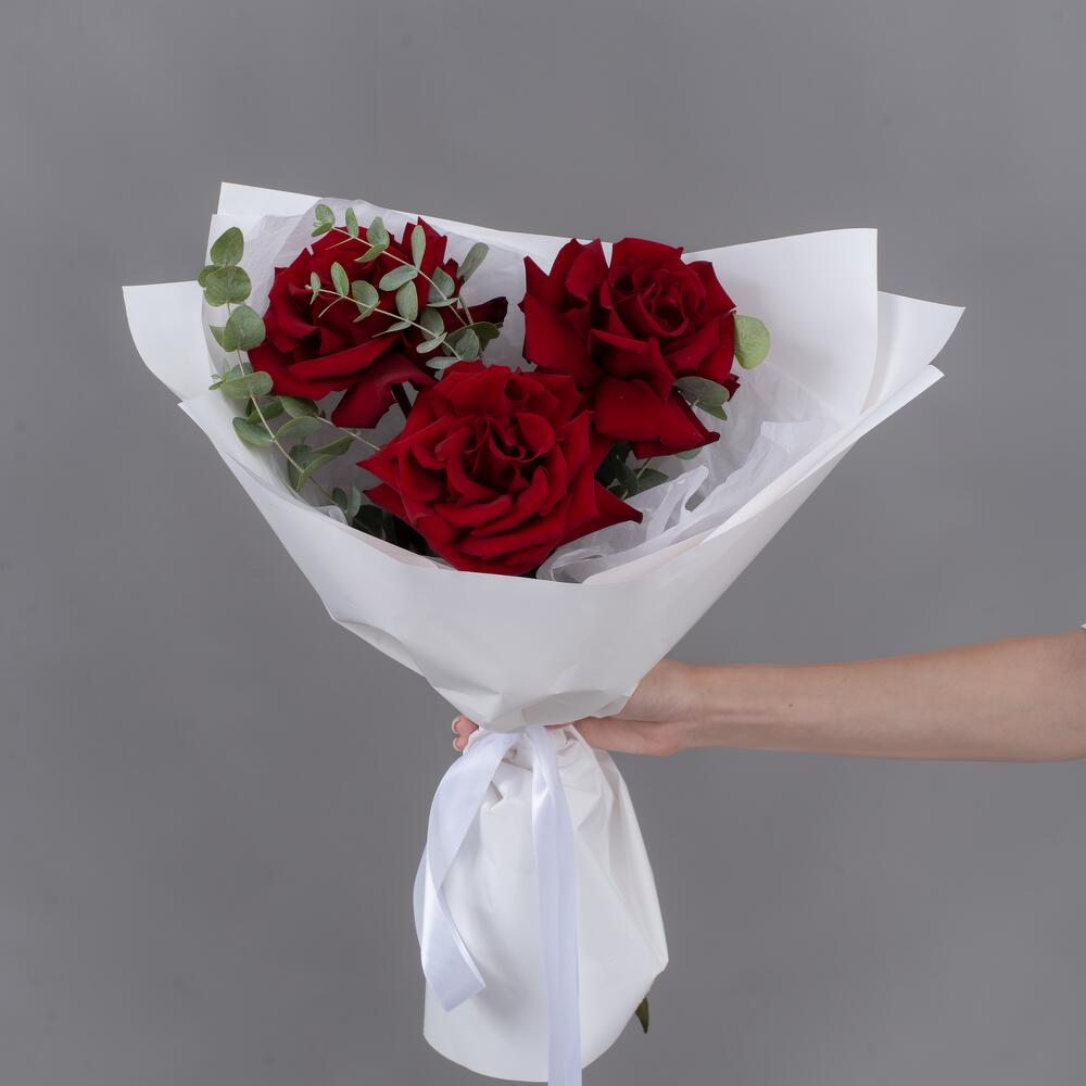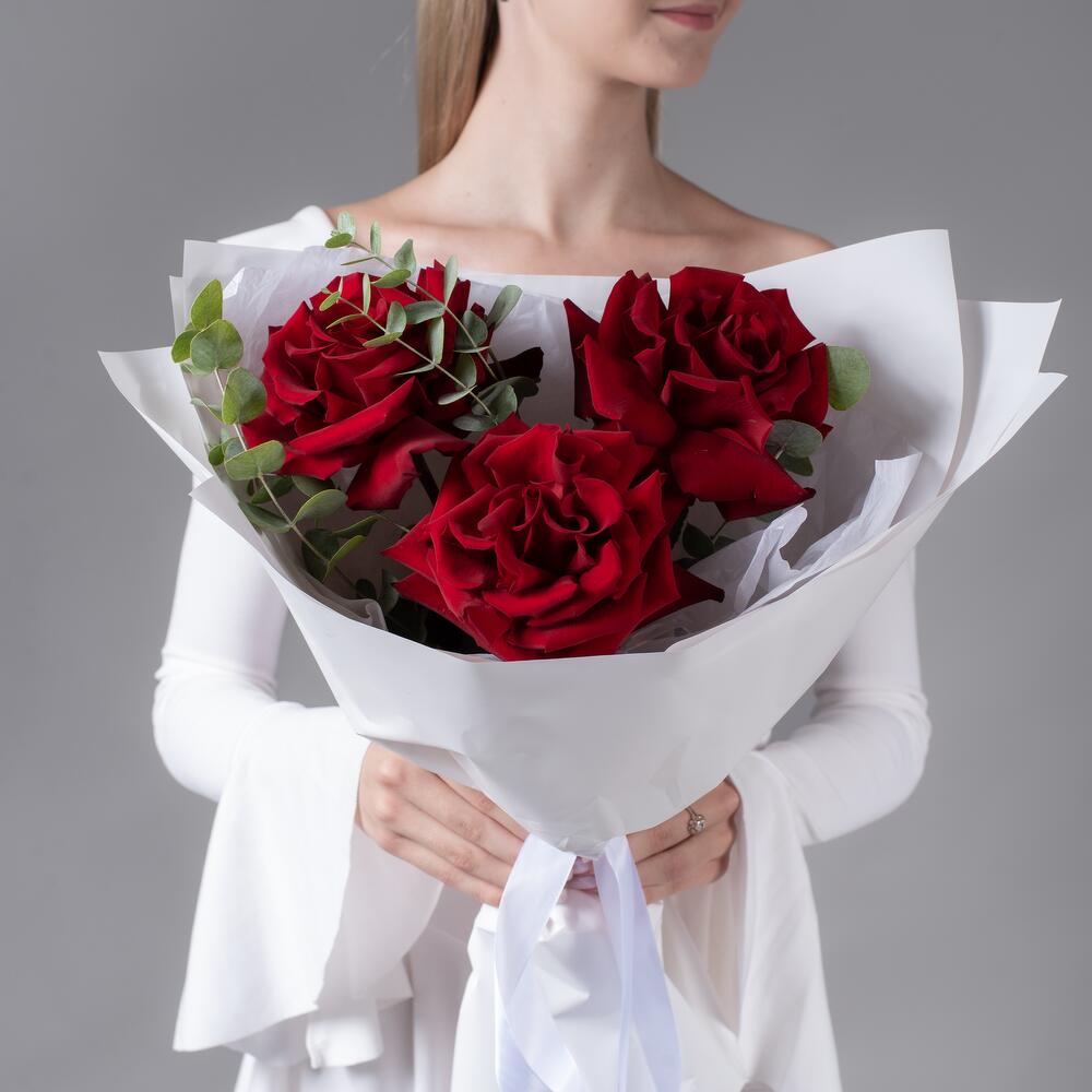 Букет из 3 бордовых, французских роз с эвкалиптом