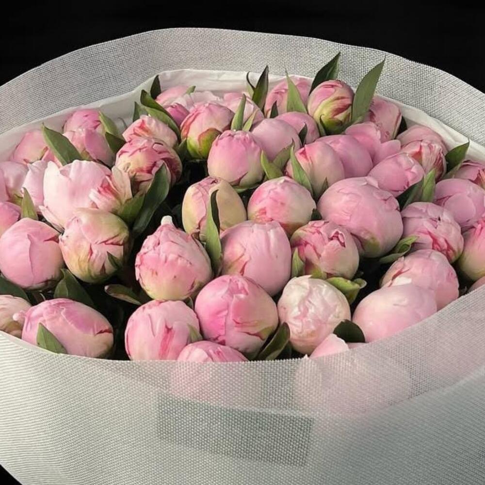 Лента атласная - 1 шт. Упаковка дизайнерская - 1 шт. Открыточка с вашими пожеланиями - 1 шт. пионы - 45 шт. прекрасное настроение - 1000 шт.