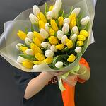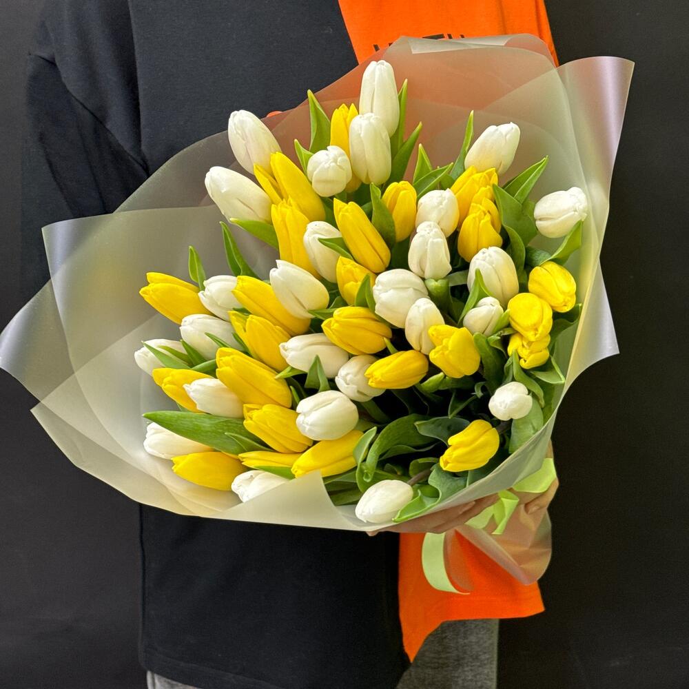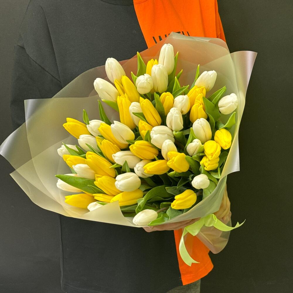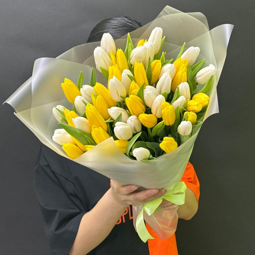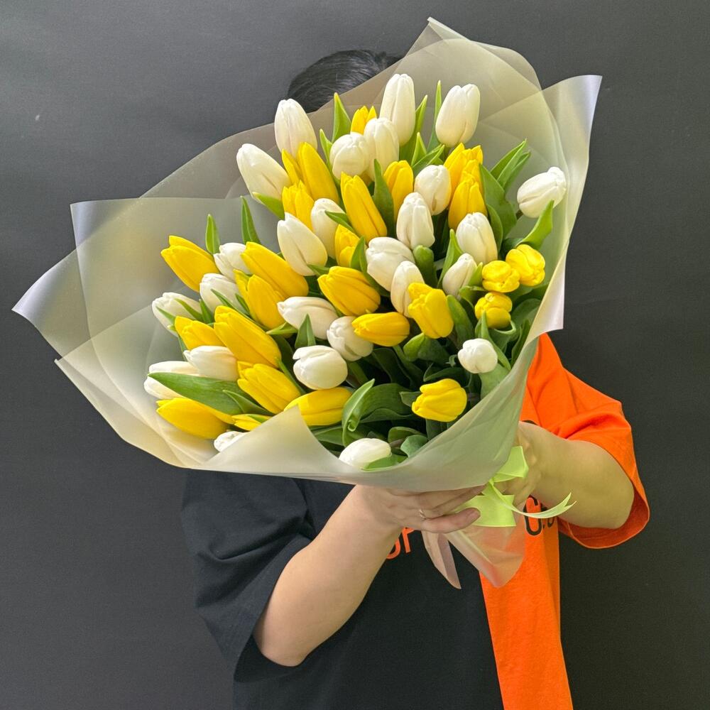Тюльпан - 51 шт. Лента атласная - 1 шт. Упаковка матовая пленка - 4 шт.