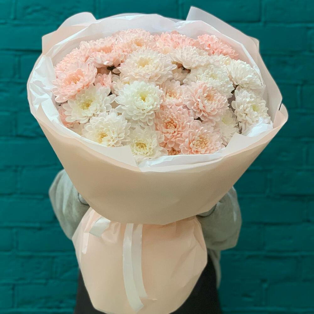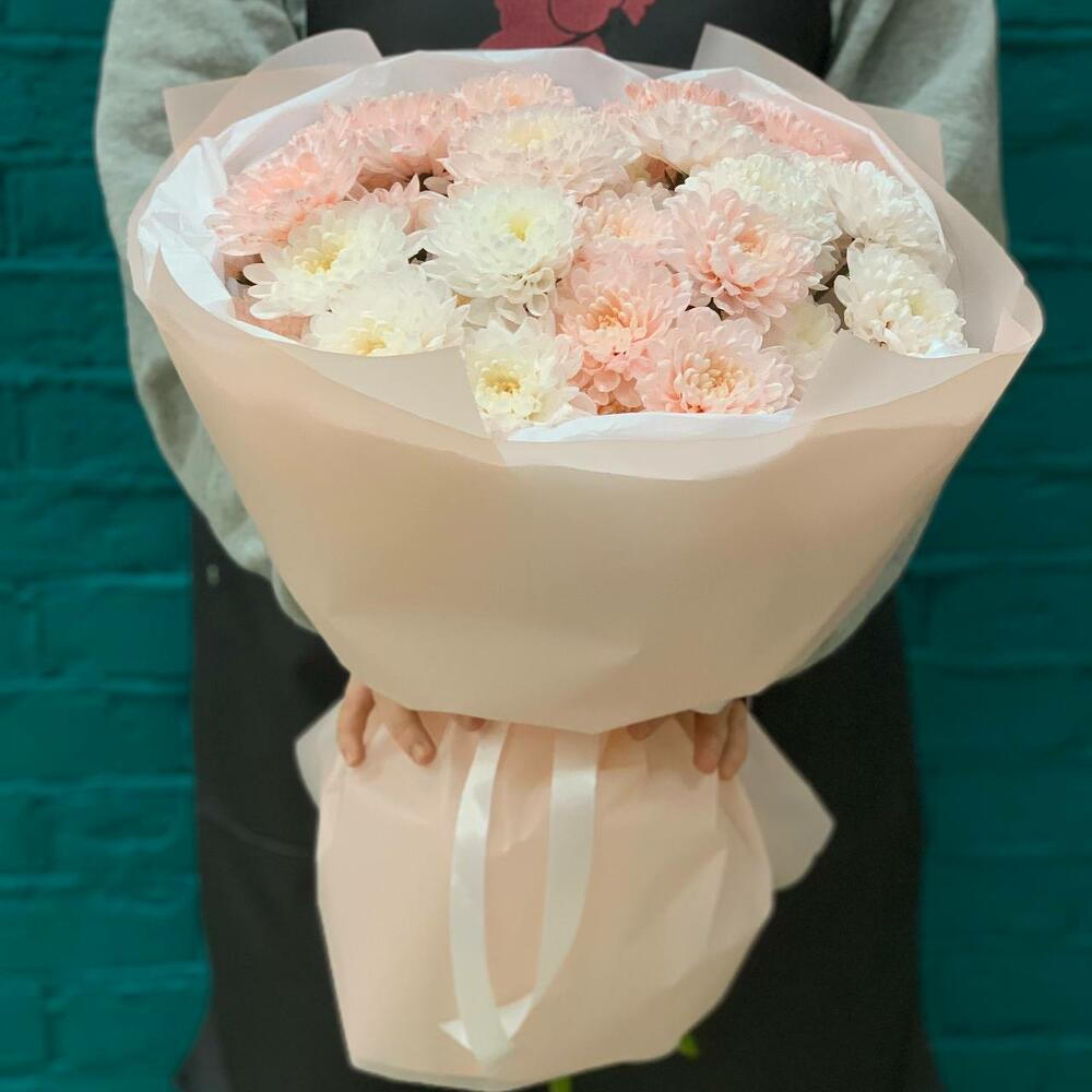 Хризантема кустовая - 7 шт. Упаковка - 1 шт. Лента атласная - 1 шт. Тишью - 2 шт. технический материал - 1 шт.