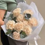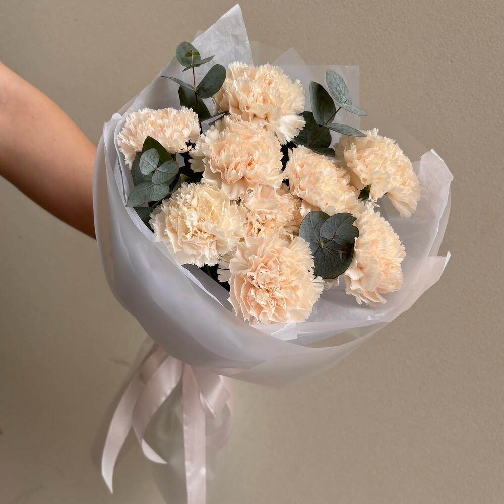 Букет из пышных кремовых диантусов и ароматного эвкалипта в стильном оформлении станет прекрасным подарком без повода и стойким украшением интерьера. Подарок для мамы, бабушки, учителя, врача, коллеги, друзей, родных, любимых и близких