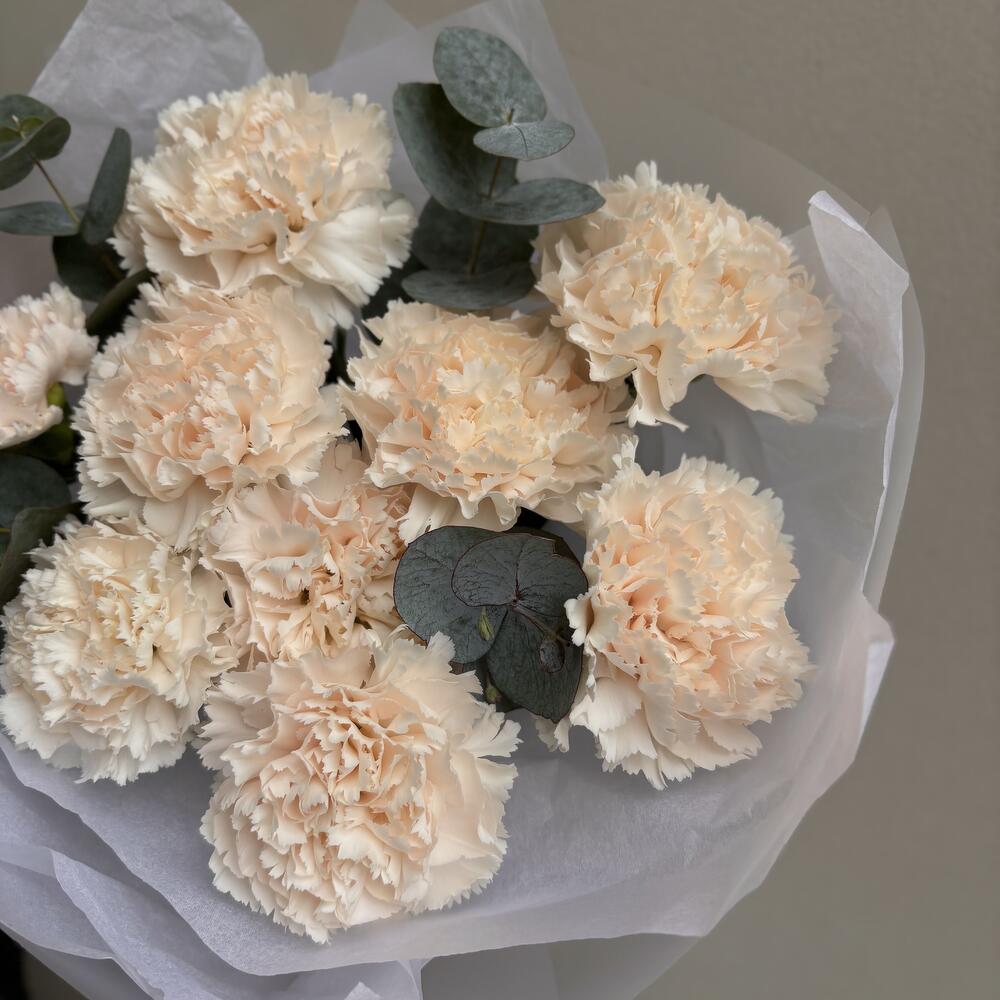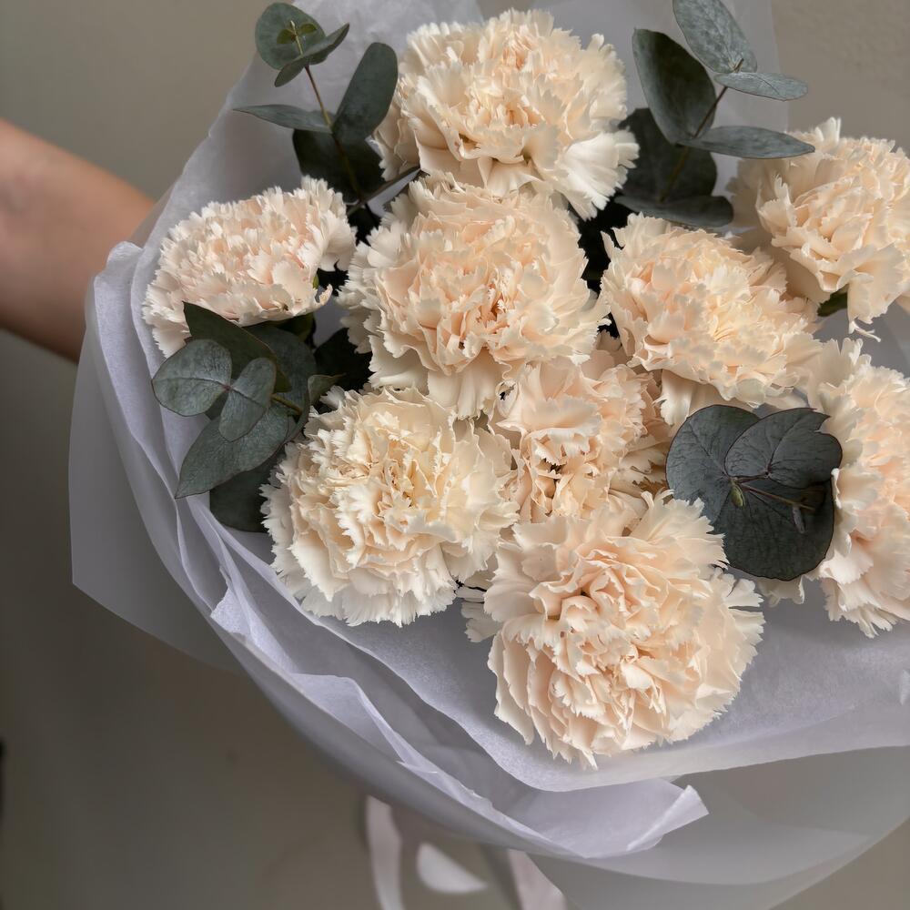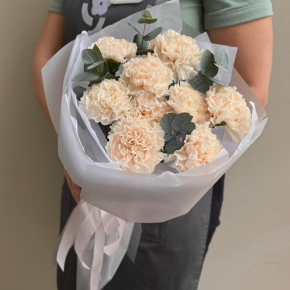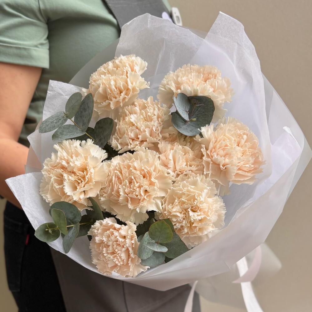 Букет из 9 кремовых диантусов с эвкалиптом