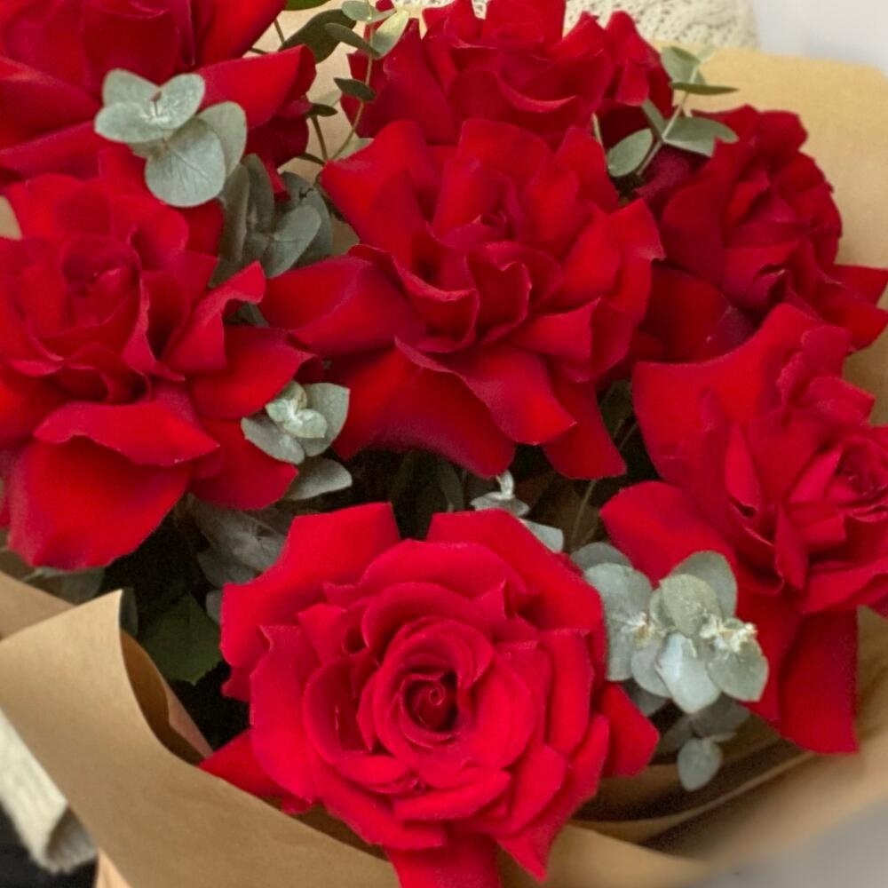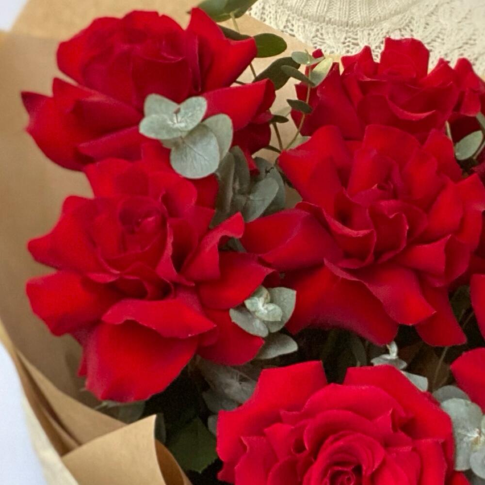Роскошная ажурная Роза сорта Нина с добавлением эвкалипта смотрится роскошно и стильно. Упаковка крафтовая подчеркивает элегантность роз
