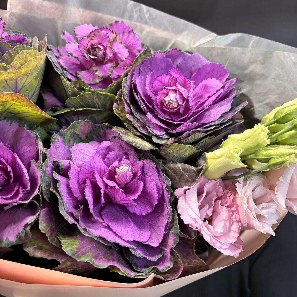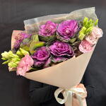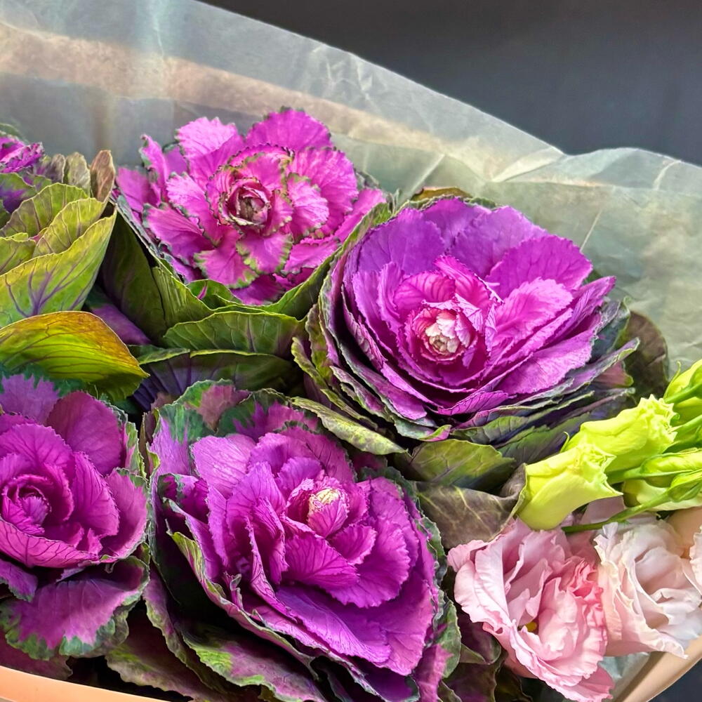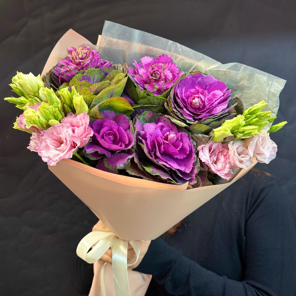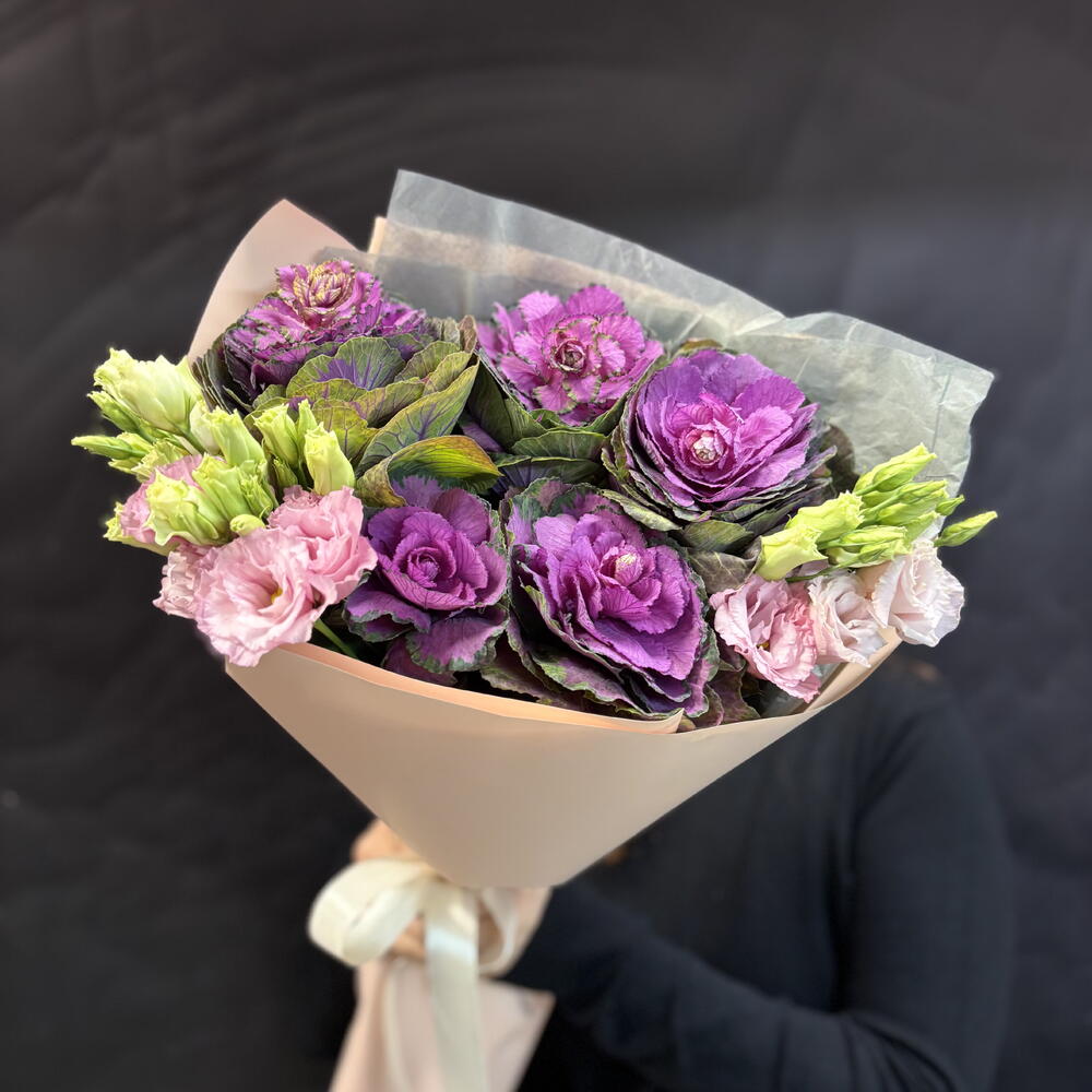 Брассика - 5 шт. Упаковка дизайнерская - 4 шт. эустома розовая - 2 шт.
