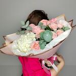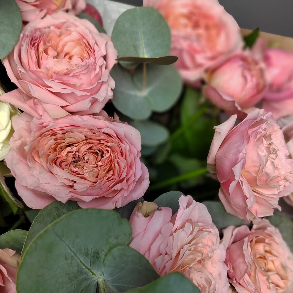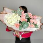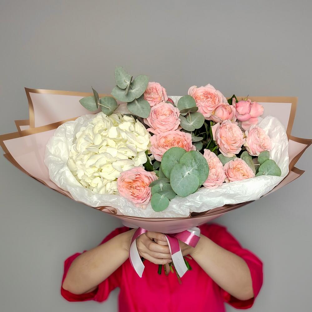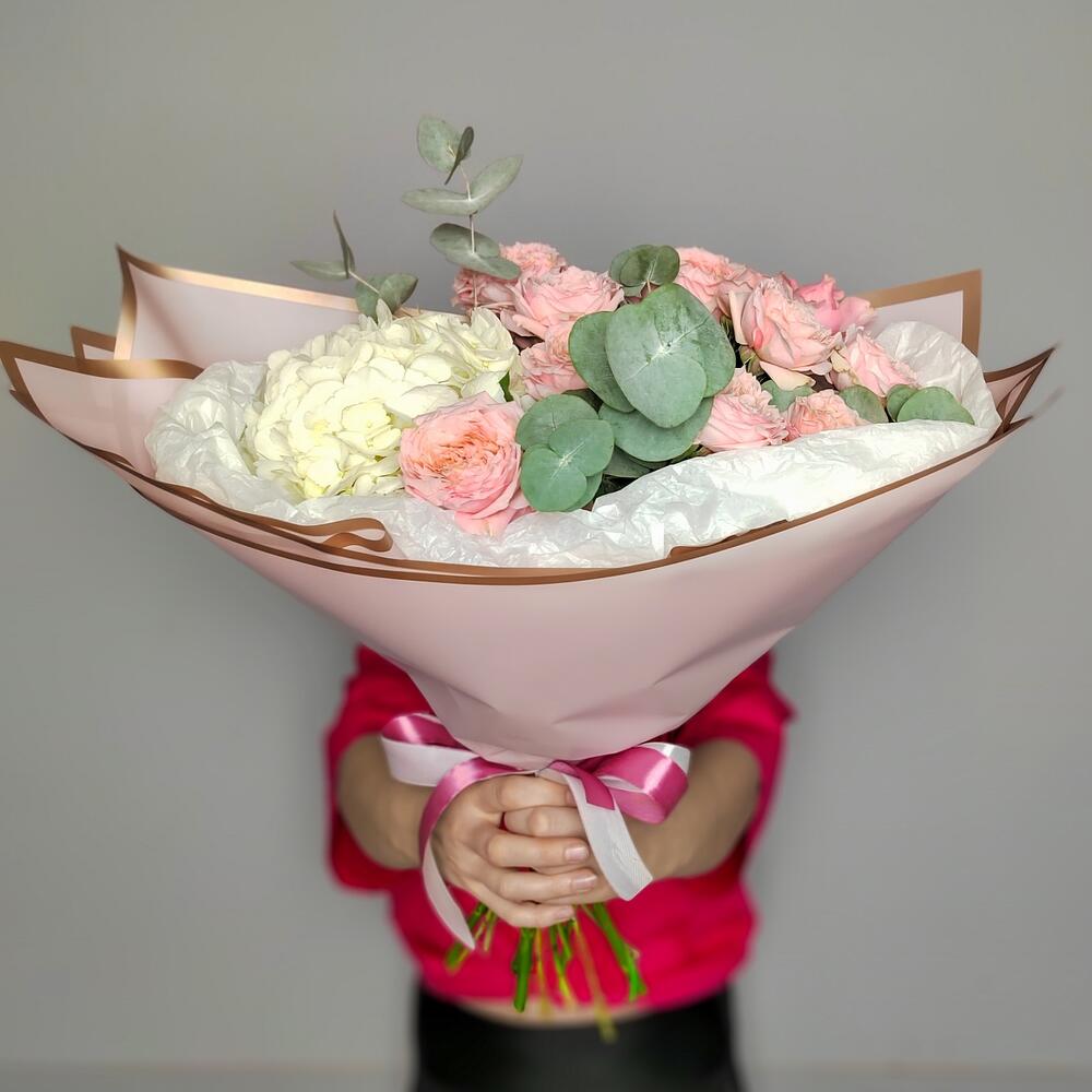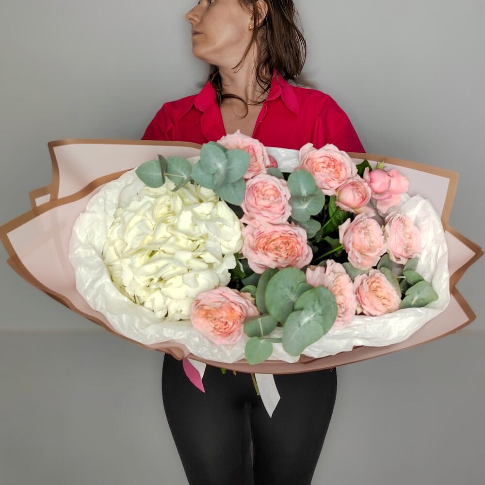 Авторский букет из пионовидной садовой розы джульета белой гортензии и эвкалипта