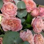 Эвкалипт - 5 шт. Лента атласная - 2 шт. Гортензия белая - 1 шт. Кризал (подкормка) - 1 шт. Тишью белое - 2 шт. Пленка дизайнерская - 2 шт. Кустовая пионовидная роза джульетта - 3 шт. аквапак с водой - 1 шт.