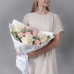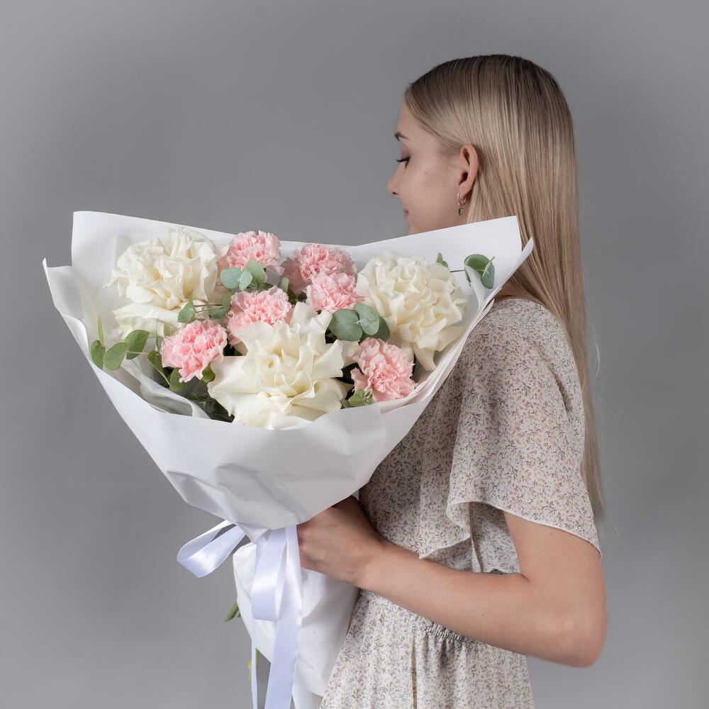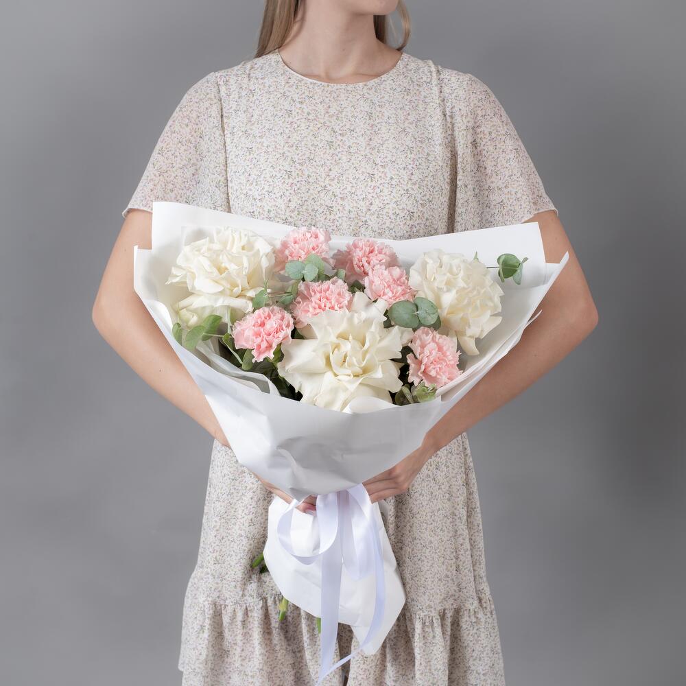 Букет из белых, французских роз и розовых гвоздик с эвкалиптом