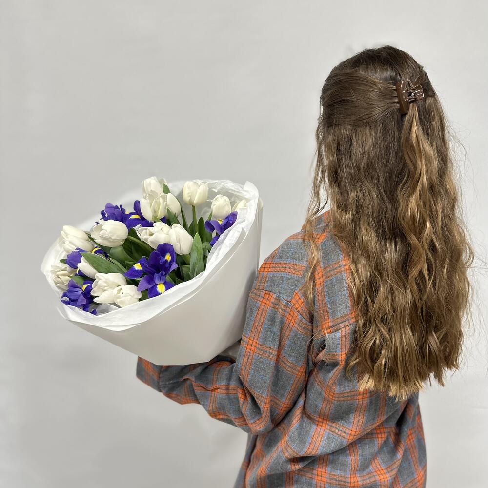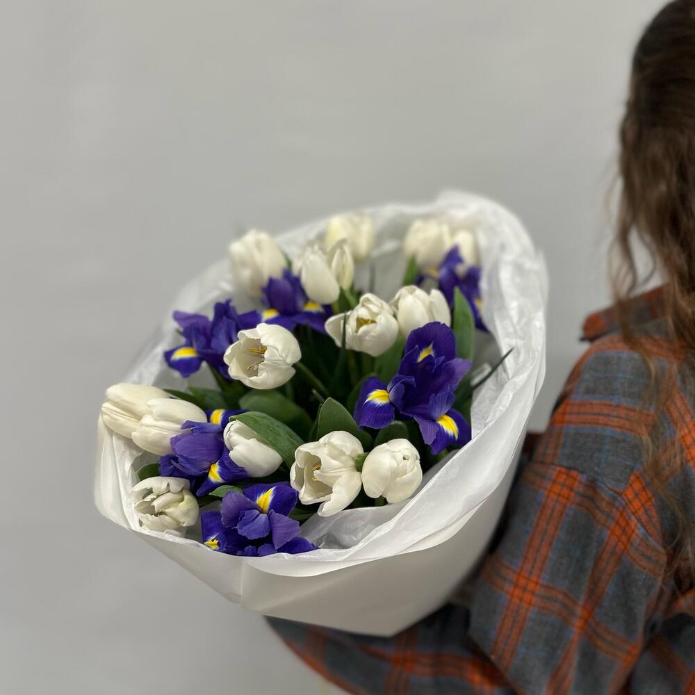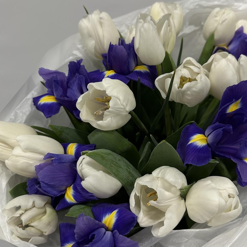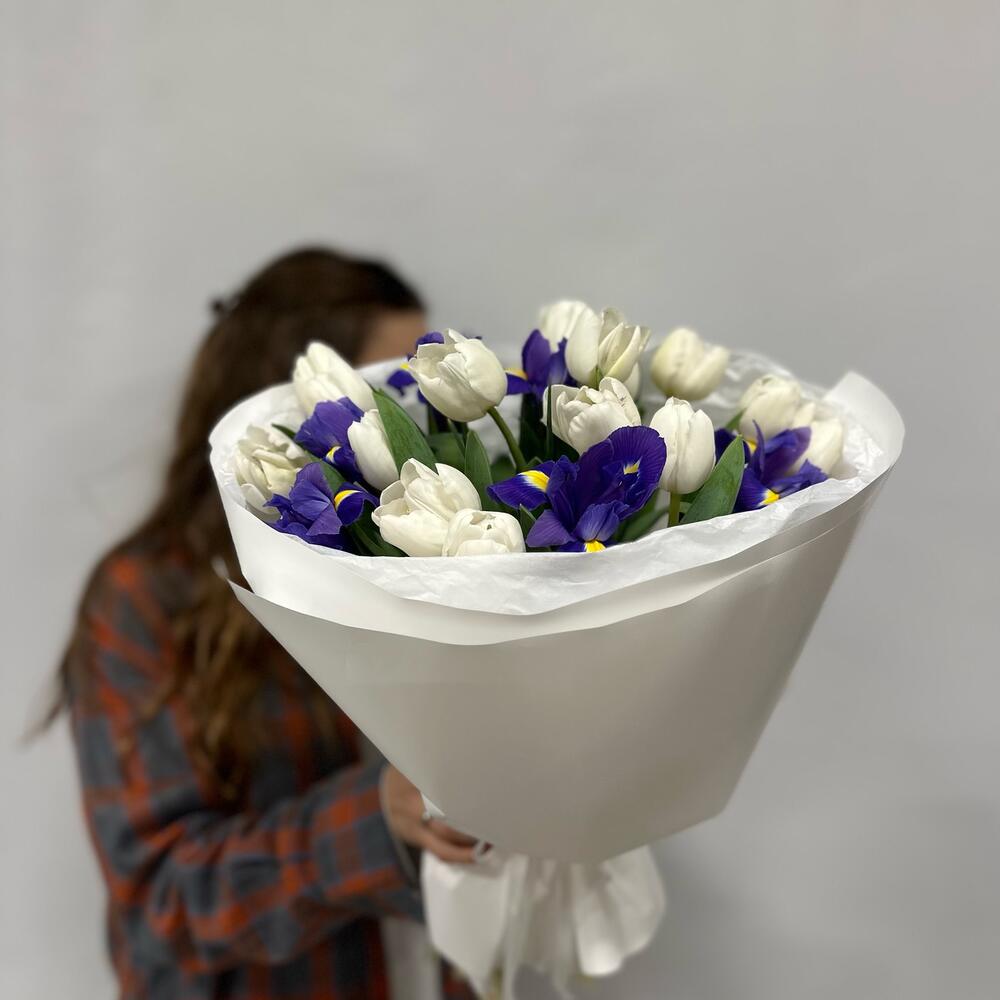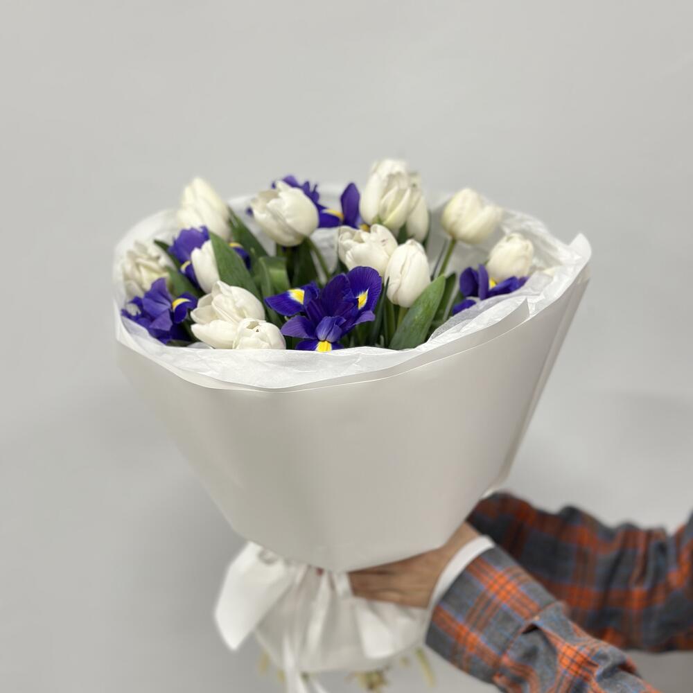 Ирис - 6 шт. Тюльпан белый - 15 шт. Дизайнерская упаковка - 2 шт.