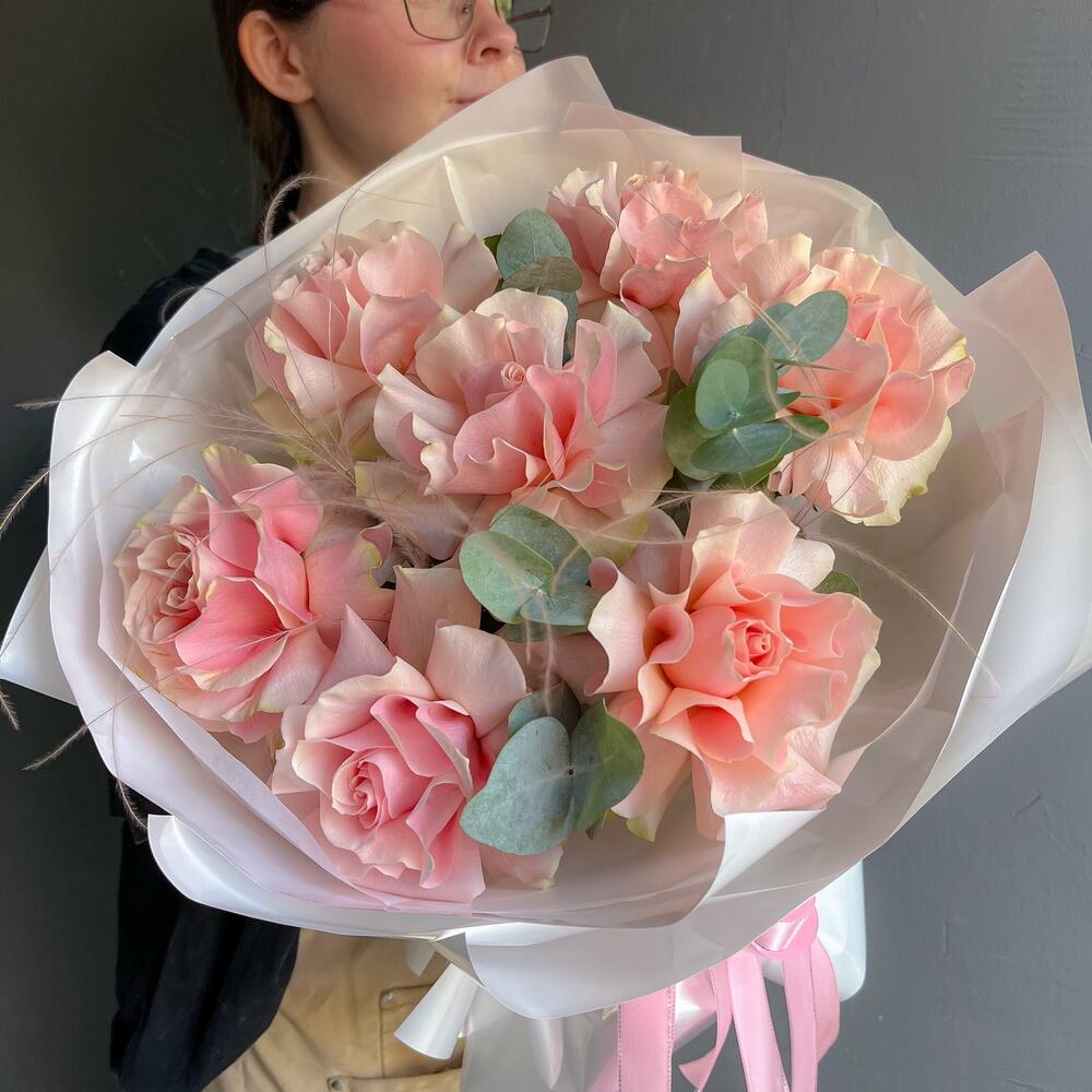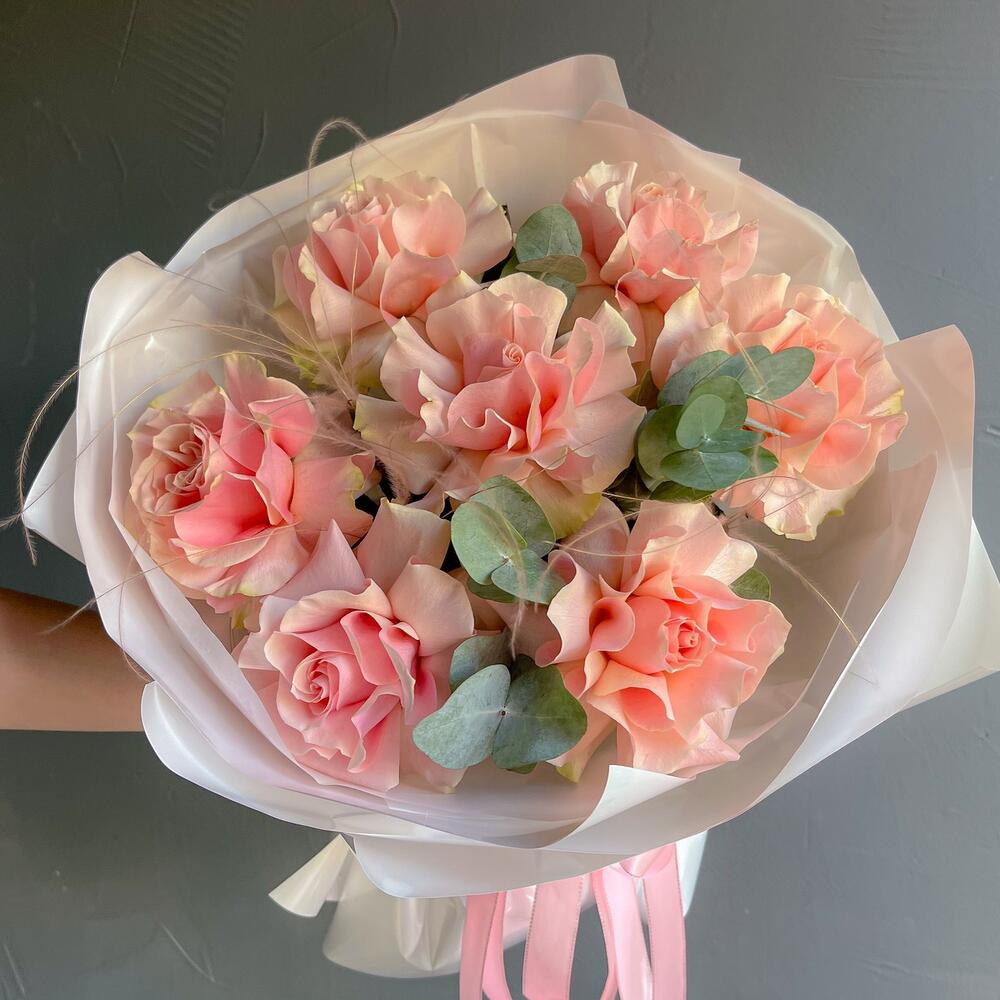 Эвкалипт - 3 шт. Роза французская розовая - 7 шт. упаковка белая фирменная - 1 шт. ковыль палочка - 3 шт.