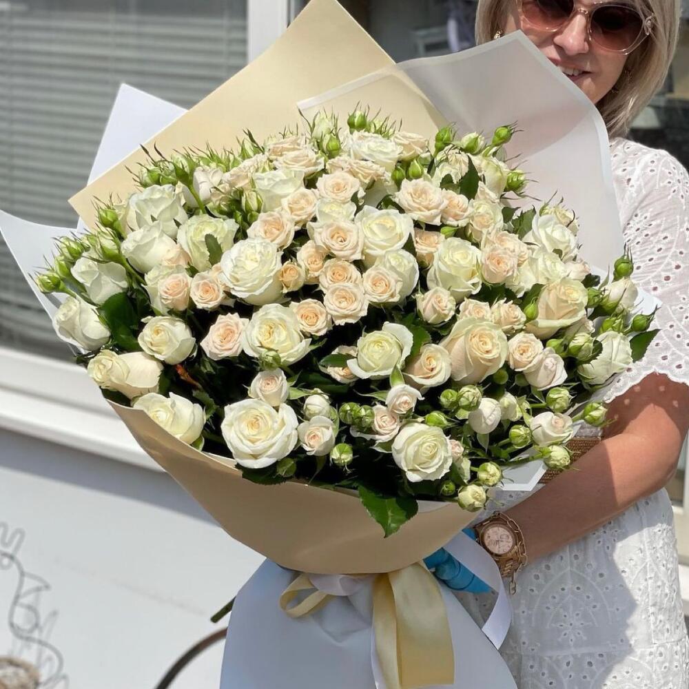 Роза Аваланж - 25 шт. Лента атласная - 1 шт. Роза кустовая кремовая - 20 шт. Упаковка дизайнерская - 5 шт.