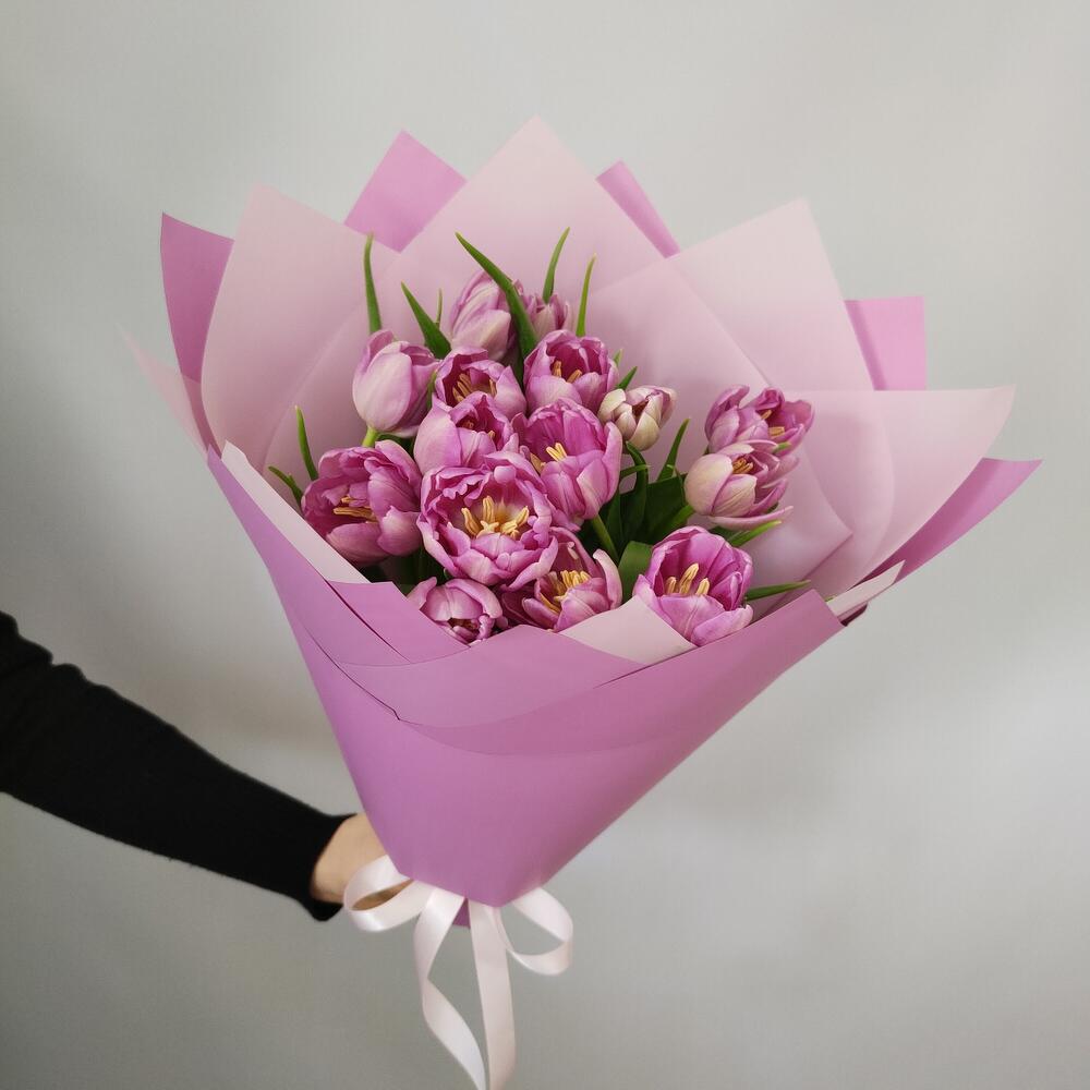 Лента атласная - 1 шт. Тюльпан Пионовидный - 15 шт. Пленка матовая - 5 шт.