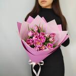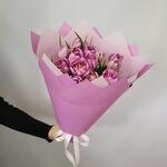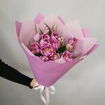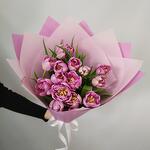 Букет из фиолетовых пионовидных тюльпанов - отличный вариант подарка на 8 марта! Размер букета около 25 см в ширину при высоте 40 см. Инструкция по уходу за букетом и подкормка для цветов бесплатно!