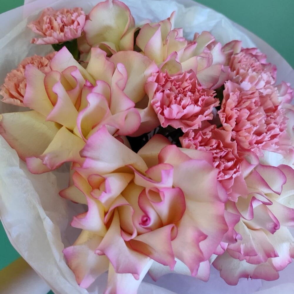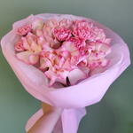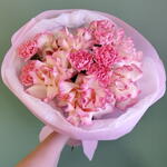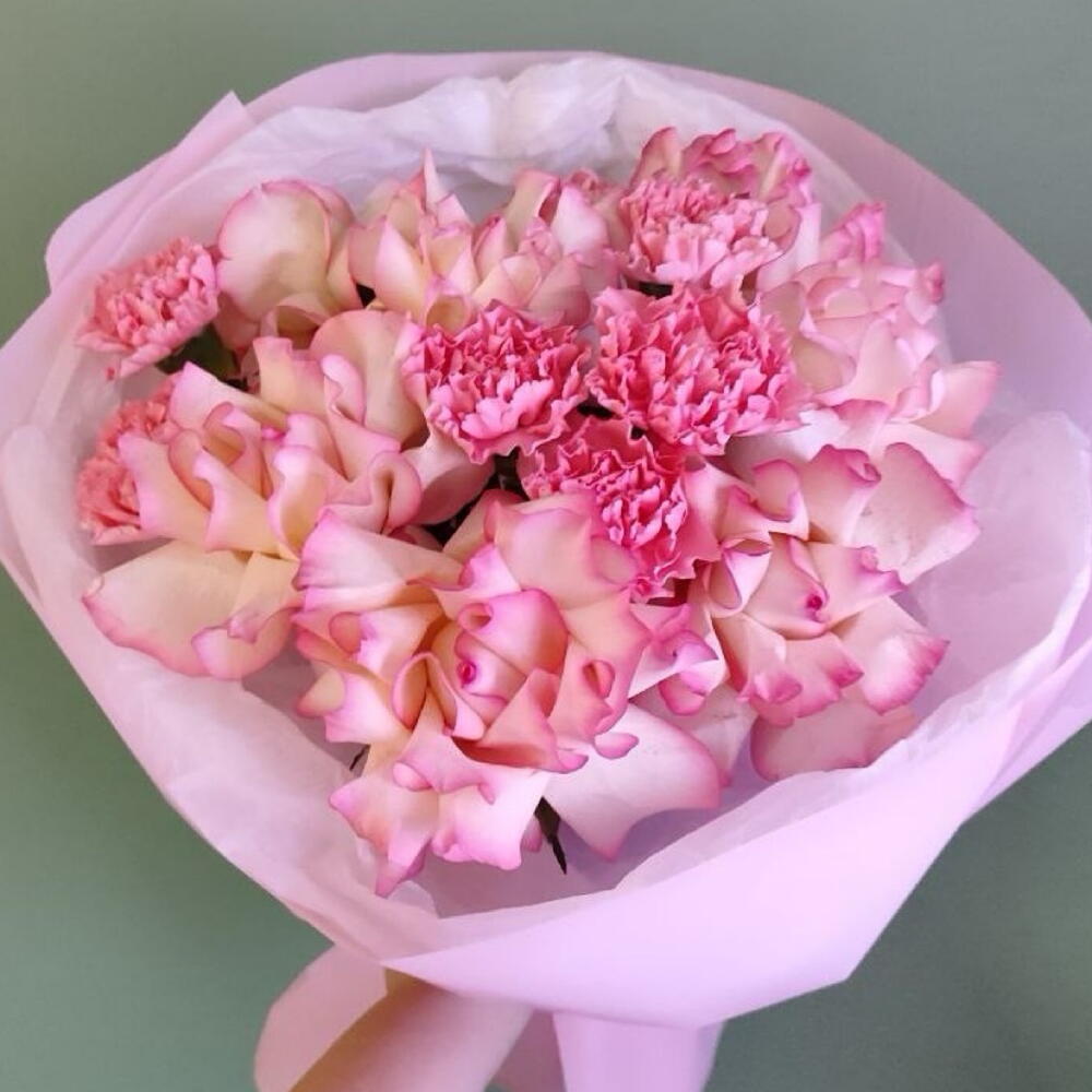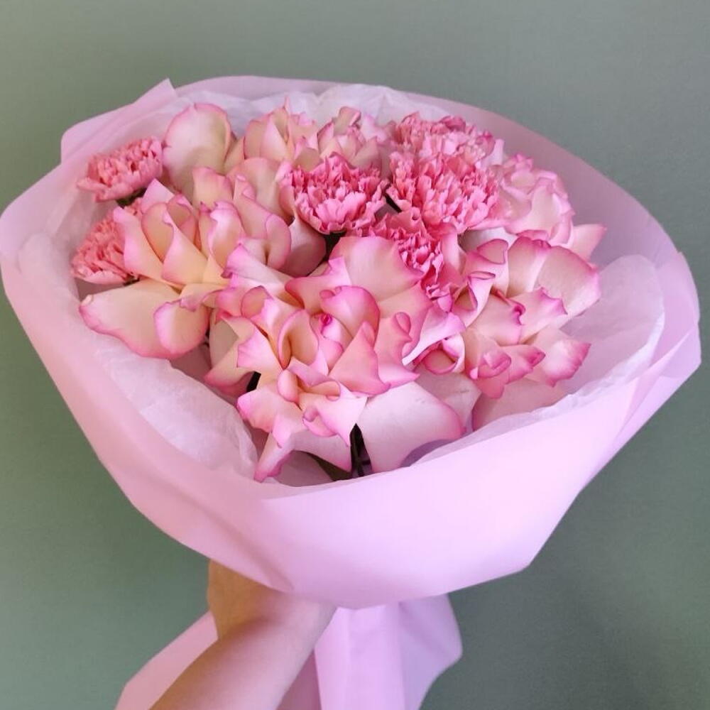 Французская кенийская роза — классика с безупречной формой и тонким ароматом. Розовый диантус (гвоздика) добавляет пышность и нежный кружевной акцент. Вместе они создают романтичный, элегантный и стойкий букет, где роскошь розы гармонично дополняется воздушным изяществом гвоздики. Идеальное сочетание для изысканного подарка.