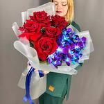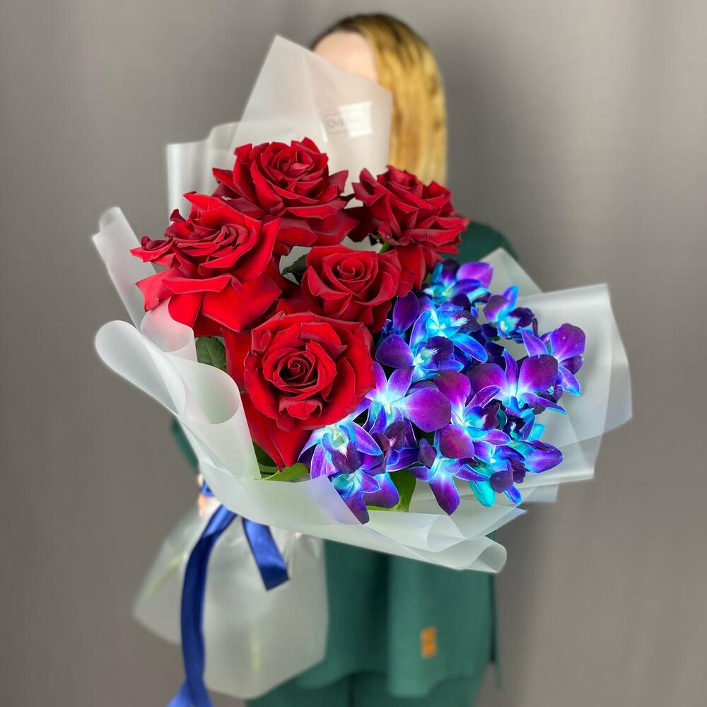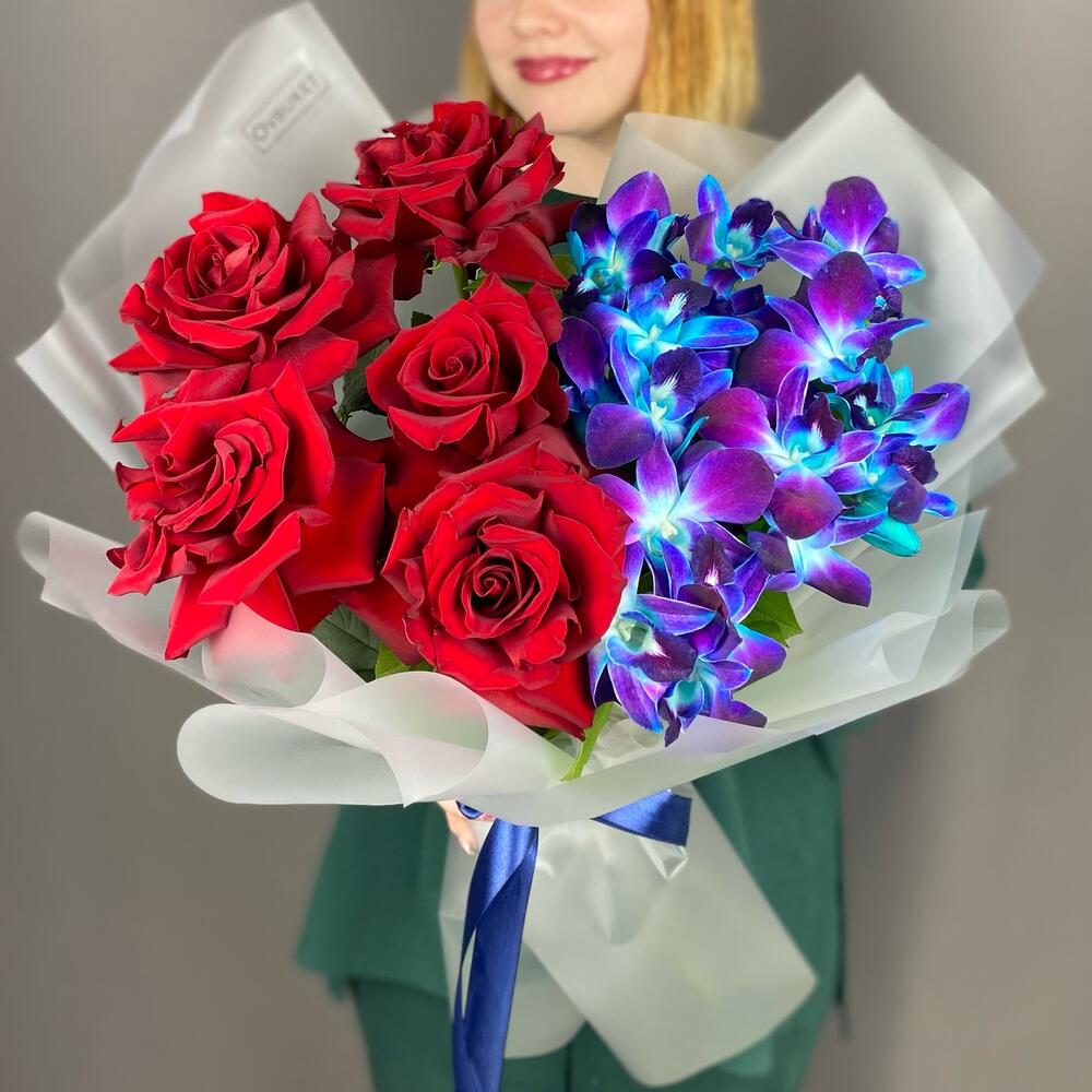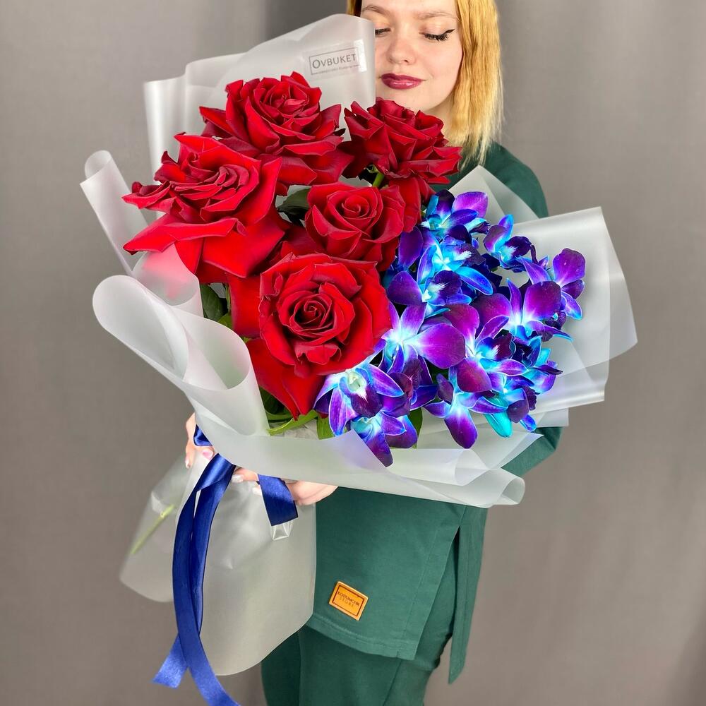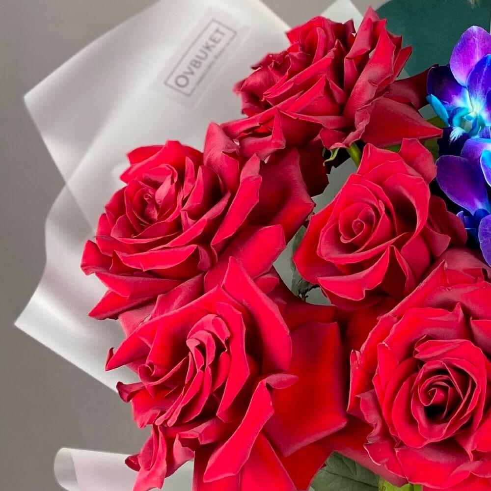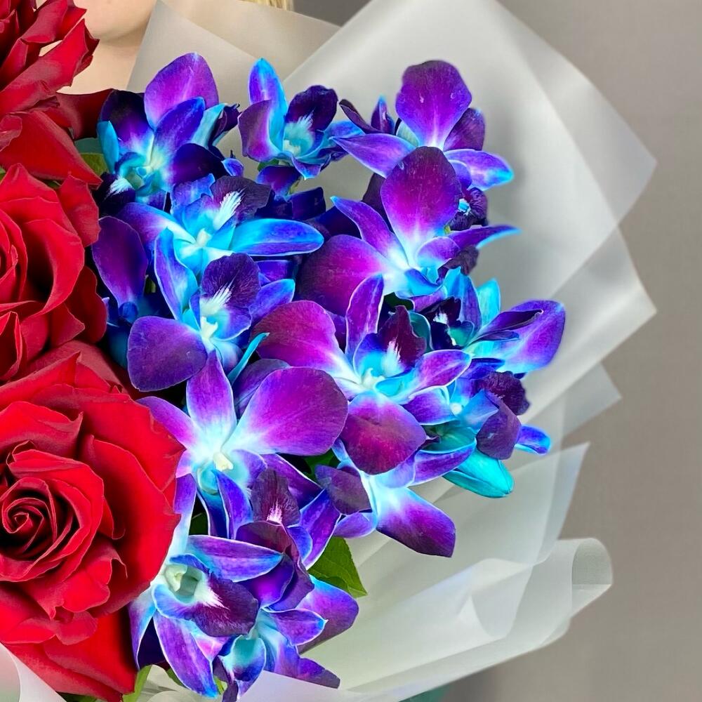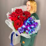 Погрузитесь в пленительную красоту этого изысканного букета. Представьте себе элегантность сияющих красных французских роз, их бархатистые лепестки являются свидетельством страсти и любви. Их сопровождают очаровательные голубые орхидеи, их нежное очарование вызывает чувство спокойствия и грации. Эта композиция, помещенная в изысканную матовую упаковку, излучает идеальный баланс изысканности и очарования, что делает ее очаровательным подарком на любой случай. В 🎁 к вашему букету вы получите: ✅конверт с открыткой, в которой мы напечатаем любое пожелание. ✅приложим инструкцию по уходу. ✅chrysal универсальная подкормка для ваших цветов 💐 Внимание! Не рекомендуется снимать упаковку и разбирать букет, так как букет собран на флористических удлинителях с водой и технической зеленью. Для комфортной транспортировки вашего букета, вы можете приобрести дополнительные товары аквабокс с водой, chrysal-универсальная подкормка для цветов и транспортировочную коробку . Так же в наличии мягкие игрушки, воздушные шары, свечи, хлопушки.