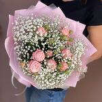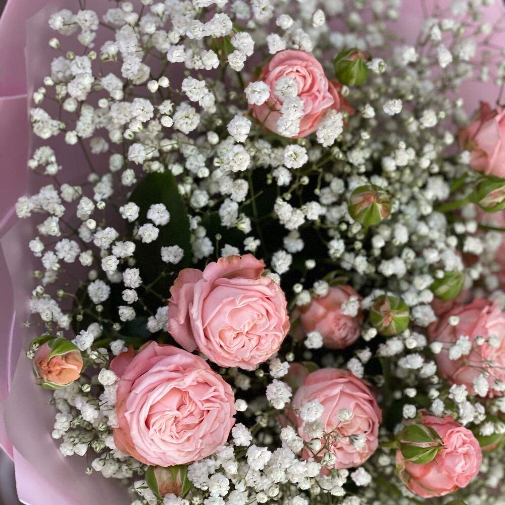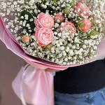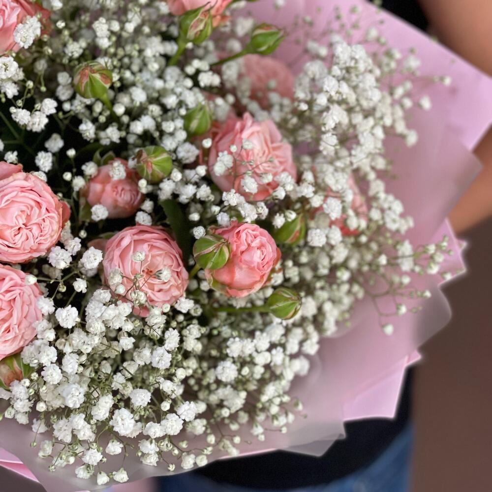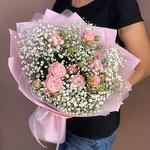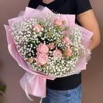 Гипсофила - 4 шт. Лента атласная - 1 шт. Роза кустовая пионовидная - 3 шт. Упаковка дизайнерская - 1 шт.