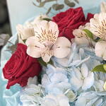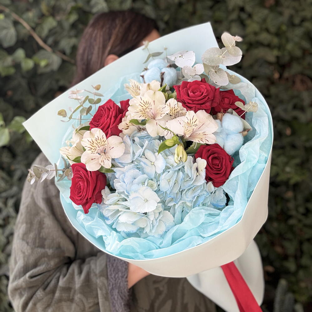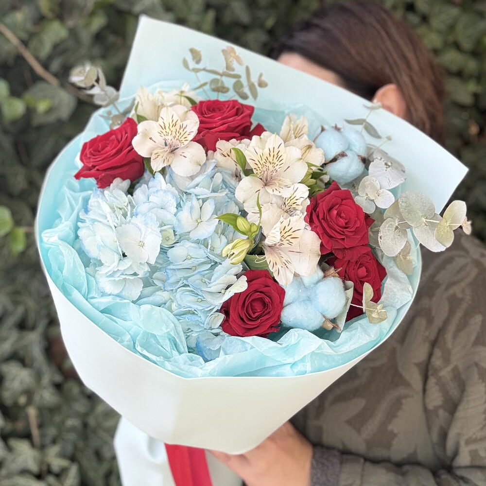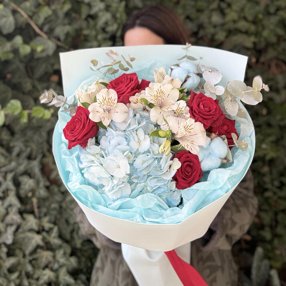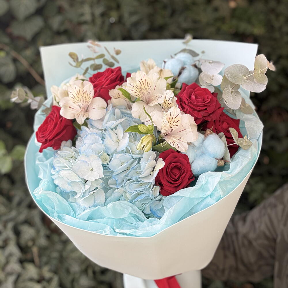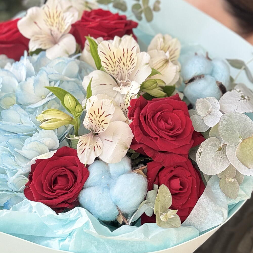 Очаровательный букет, сочетающий в себе нежные голубые оттенки гортензии и хлопка, которые создают атмосферу спокойствия и легкости. Яркие красные розы добавляют композиции выразительности и страсти, а белая альстромерия вносит нотки чистоты и изысканности. Веточки эвкалипта придают букету свежести и уникального аромата. Букет завернут в нежную голубую упаковку, что подчеркивает его элегантность и делает его идеальным подарком для любого случая.