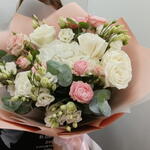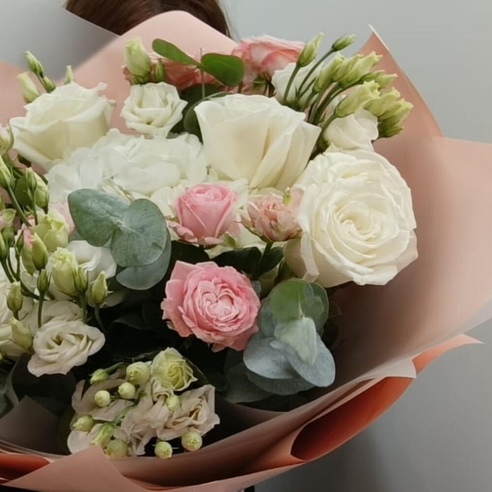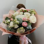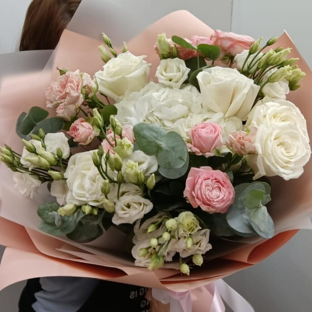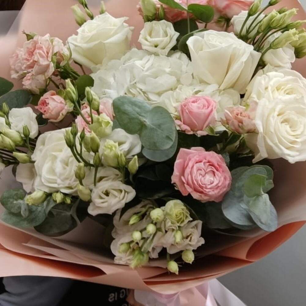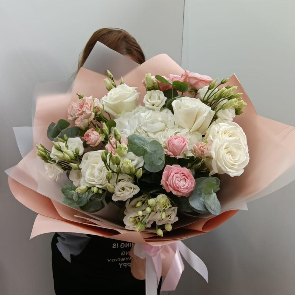 Букет из гортензии, эустомы, кустовой пионовидной розы, розы