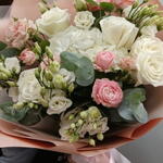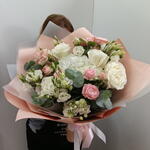 Гортензия - 1 шт. Эвкалипт - 5 шт. Роза - 5 шт. Упаковка - 6 шт. Эустома - 5 шт. Лента атласная - 2 шт. Кустовая роза пионовидная - 4 шт.