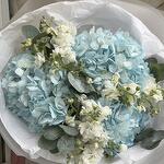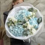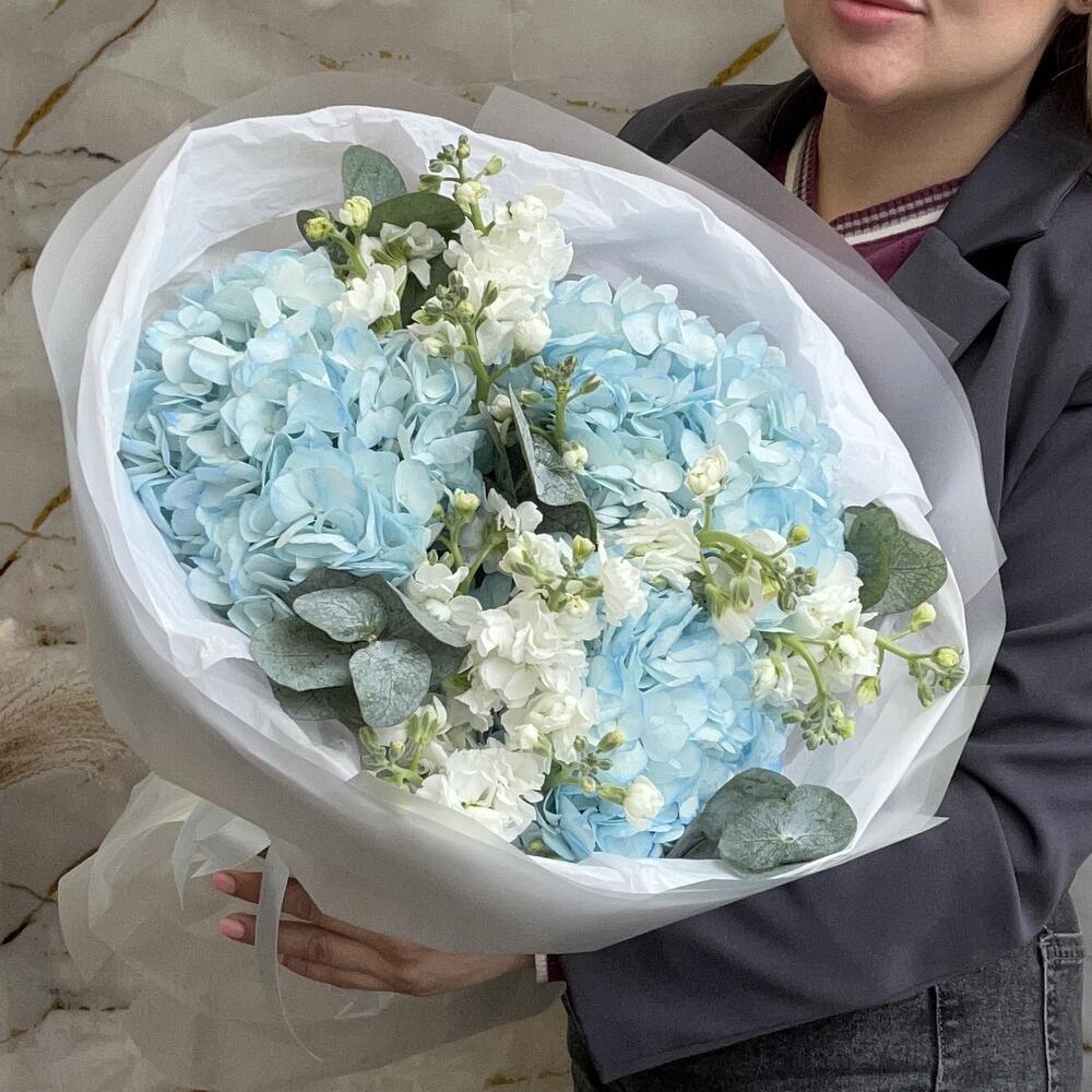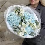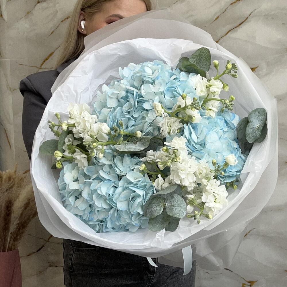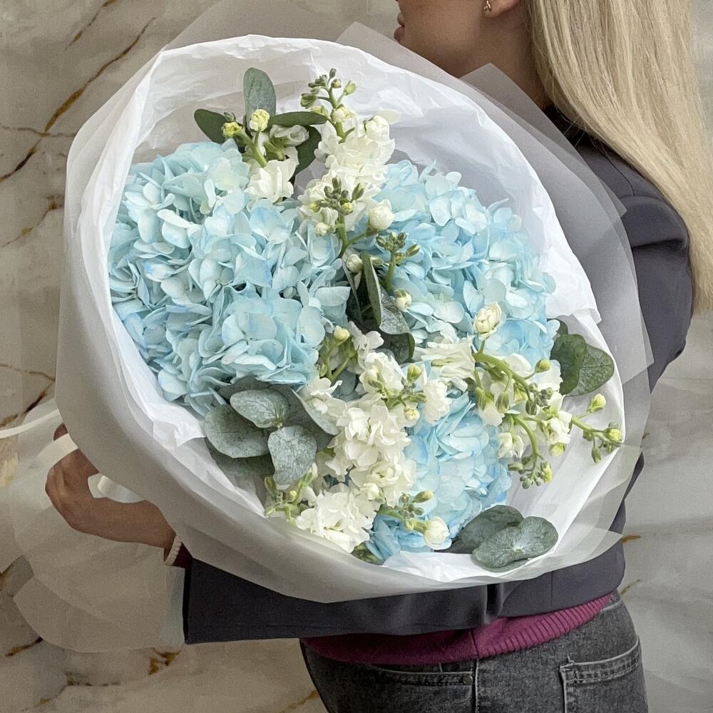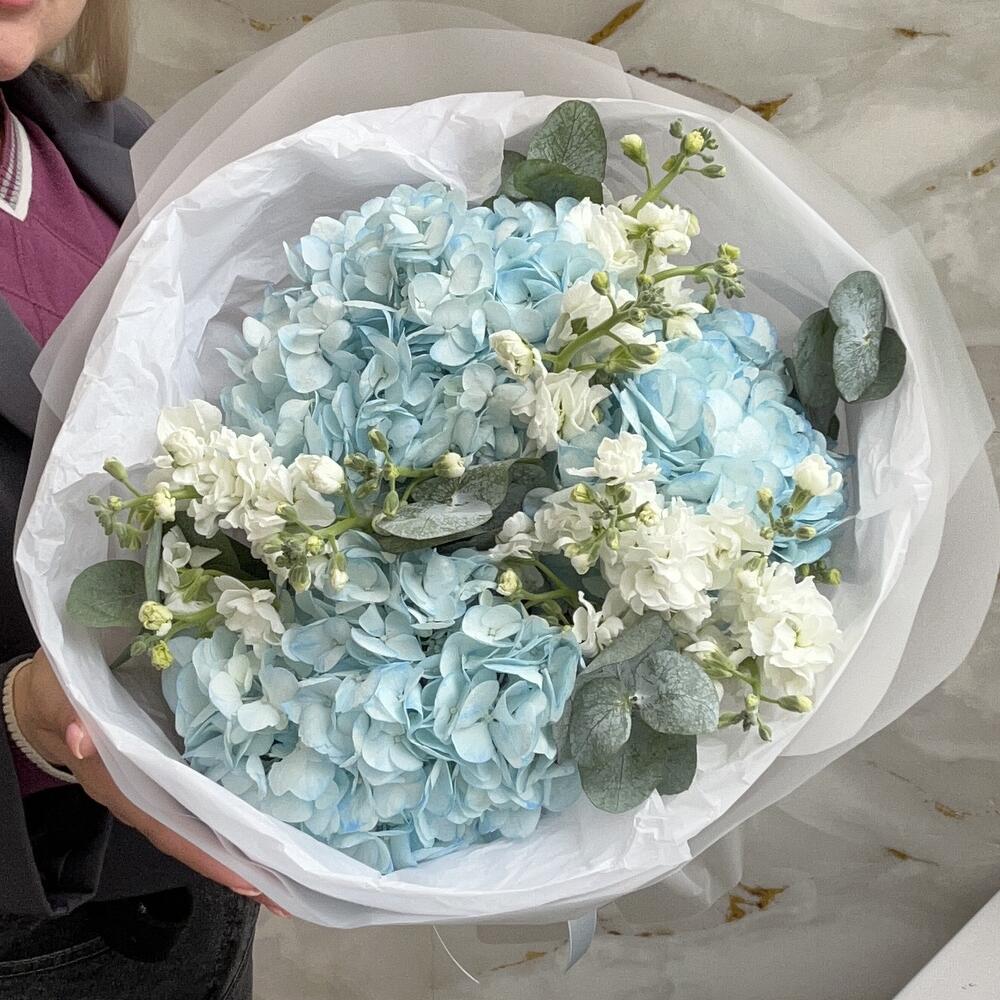Гортензия - 3 шт. Эвкалипт - 5 шт. Лента атласная - 1 шт. Упаковка дизайнерская - 1 шт. маттиола кустовая - 3 шт.