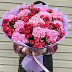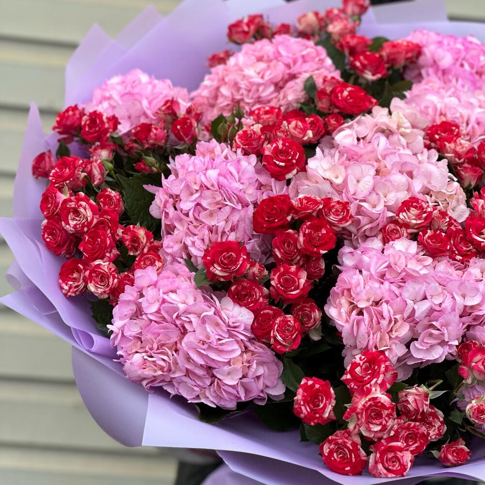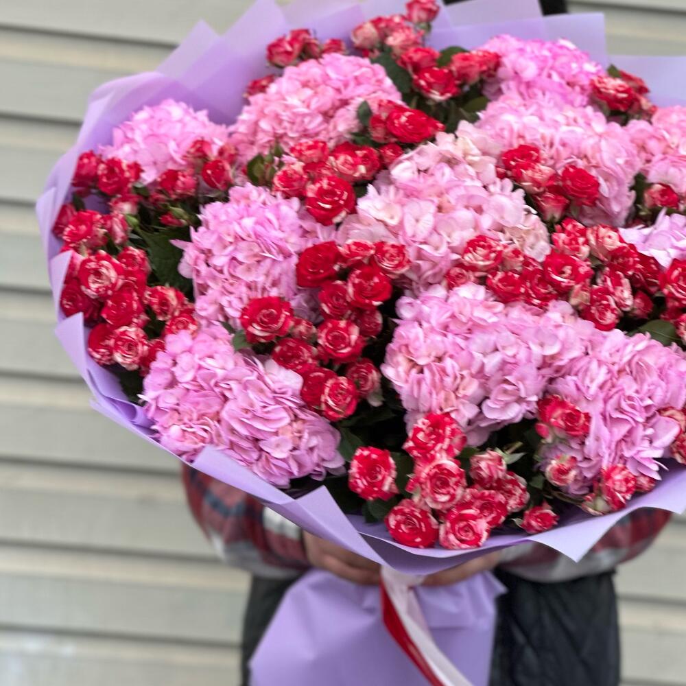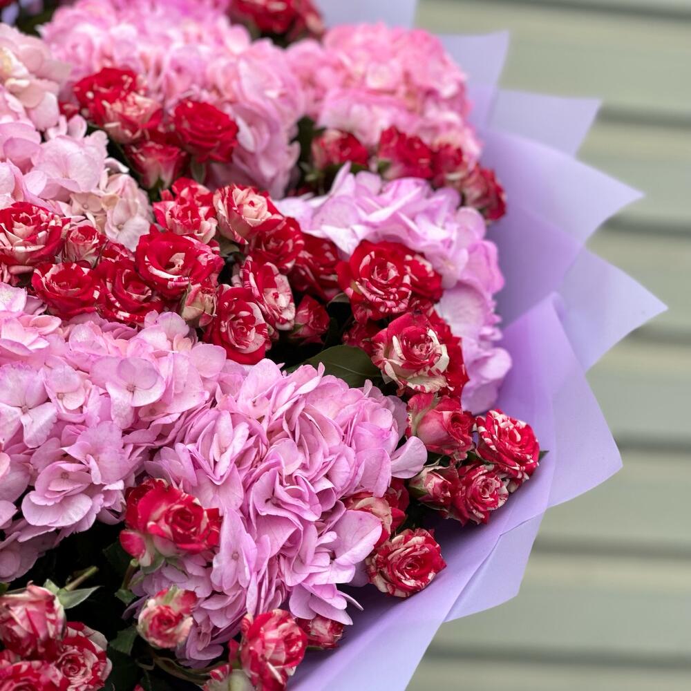 Кустовая роза - 21 шт. Лента атласная - 2 шт. Упаковка дизайнерская - 12 шт. гортензия голландия - 11 шт.