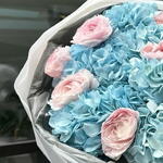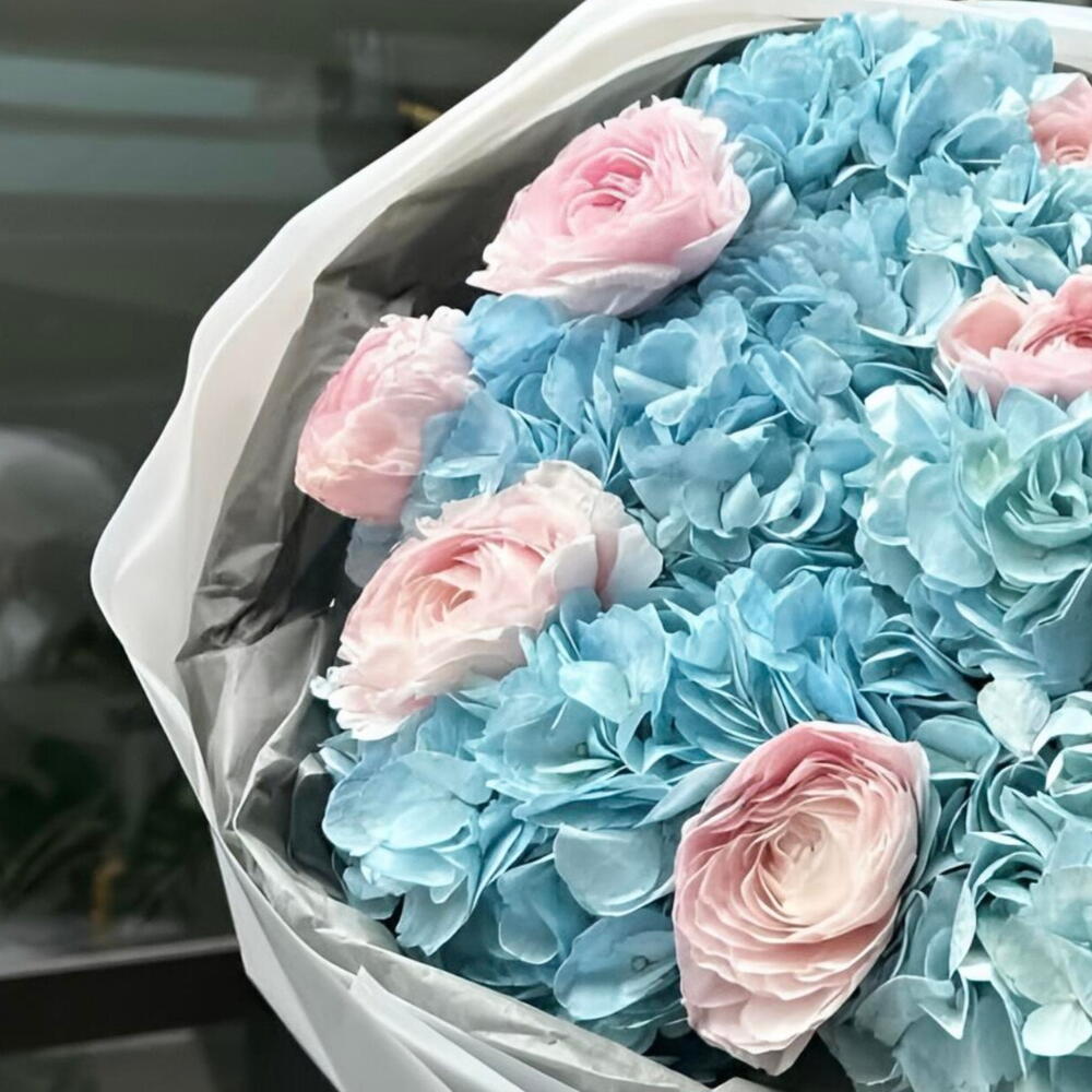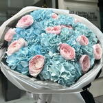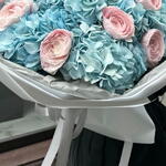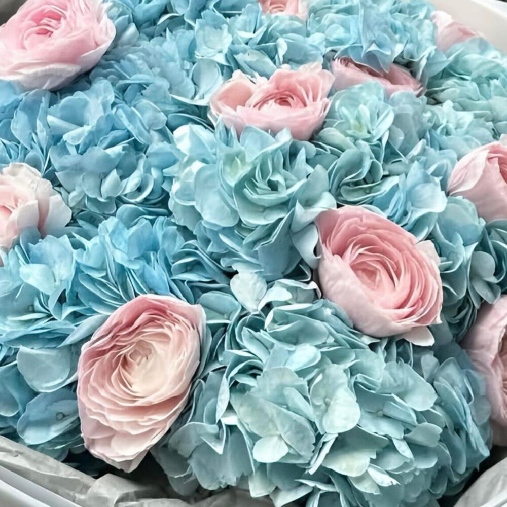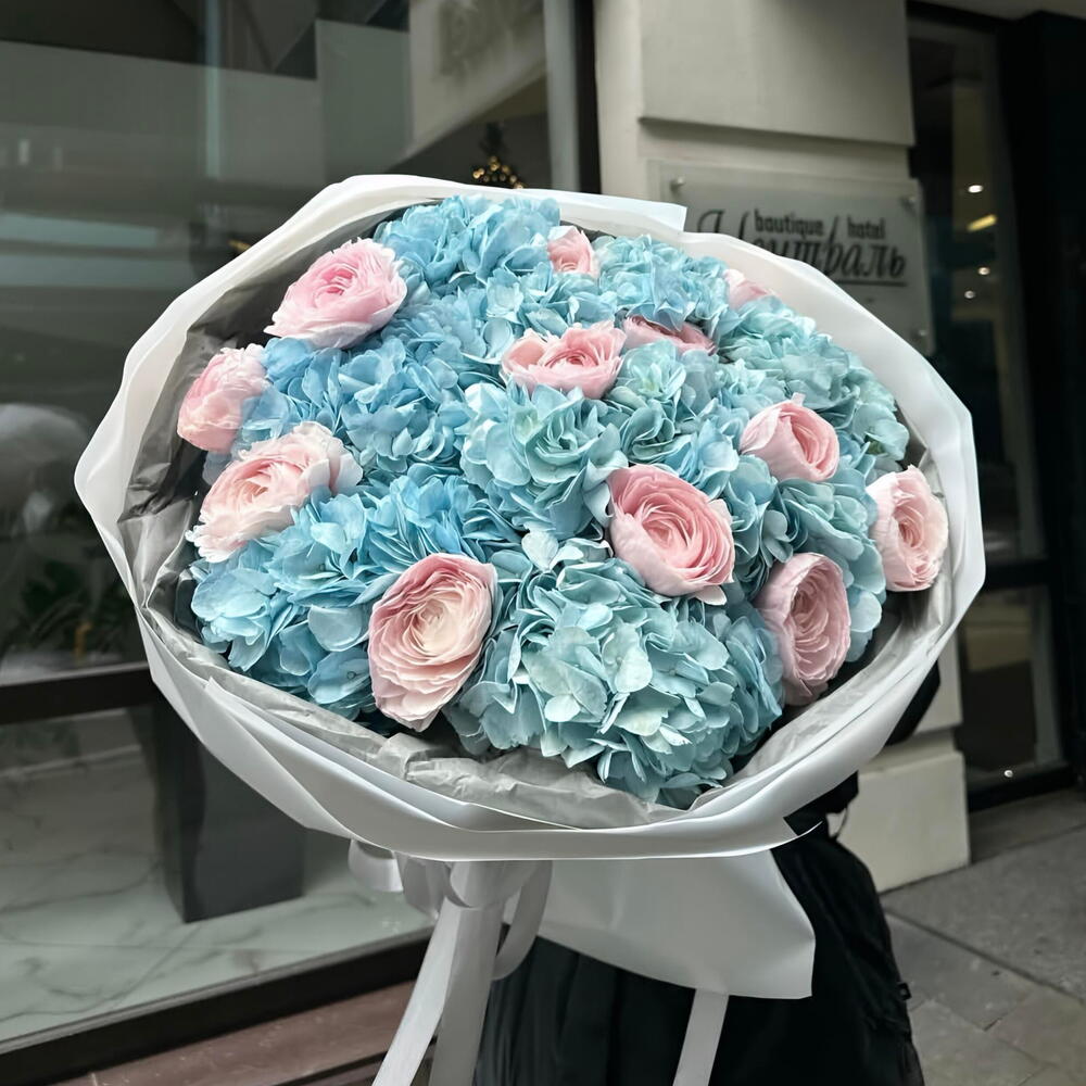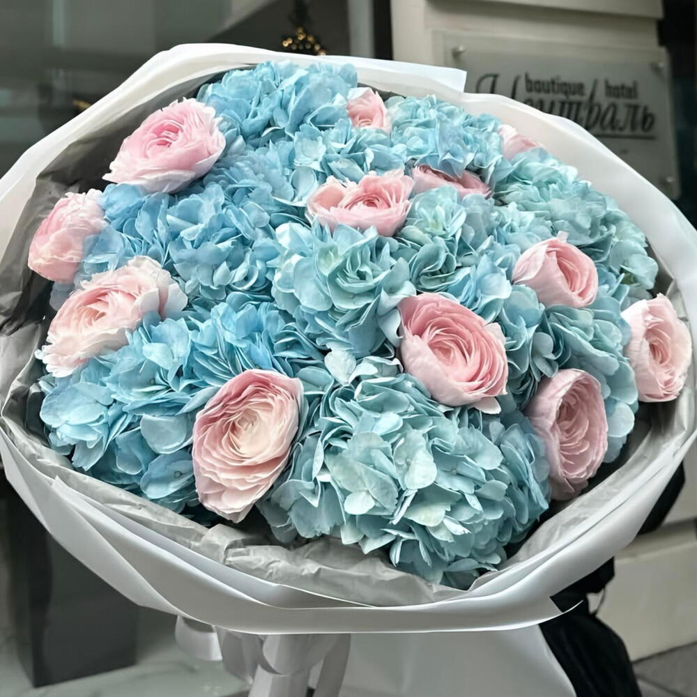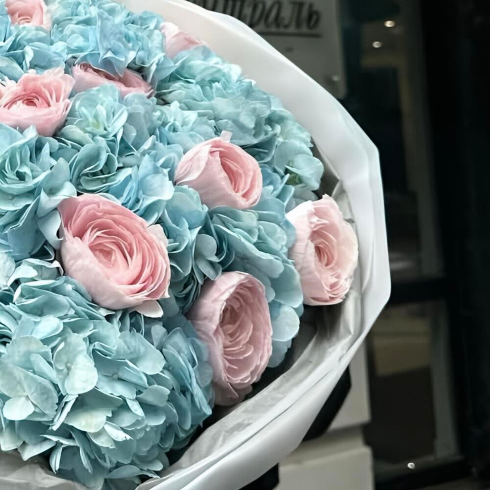Гортензия - 11 шт. Лента атласная - 1 шт. Ранункулюс - 10 шт. Упаковка дизайнерская - 1 шт. Открыточка с вашими пожеланиями - 1 шт. море положительных эмоций))) - 1000 шт.