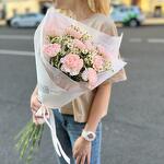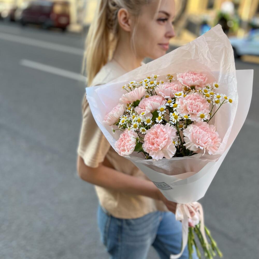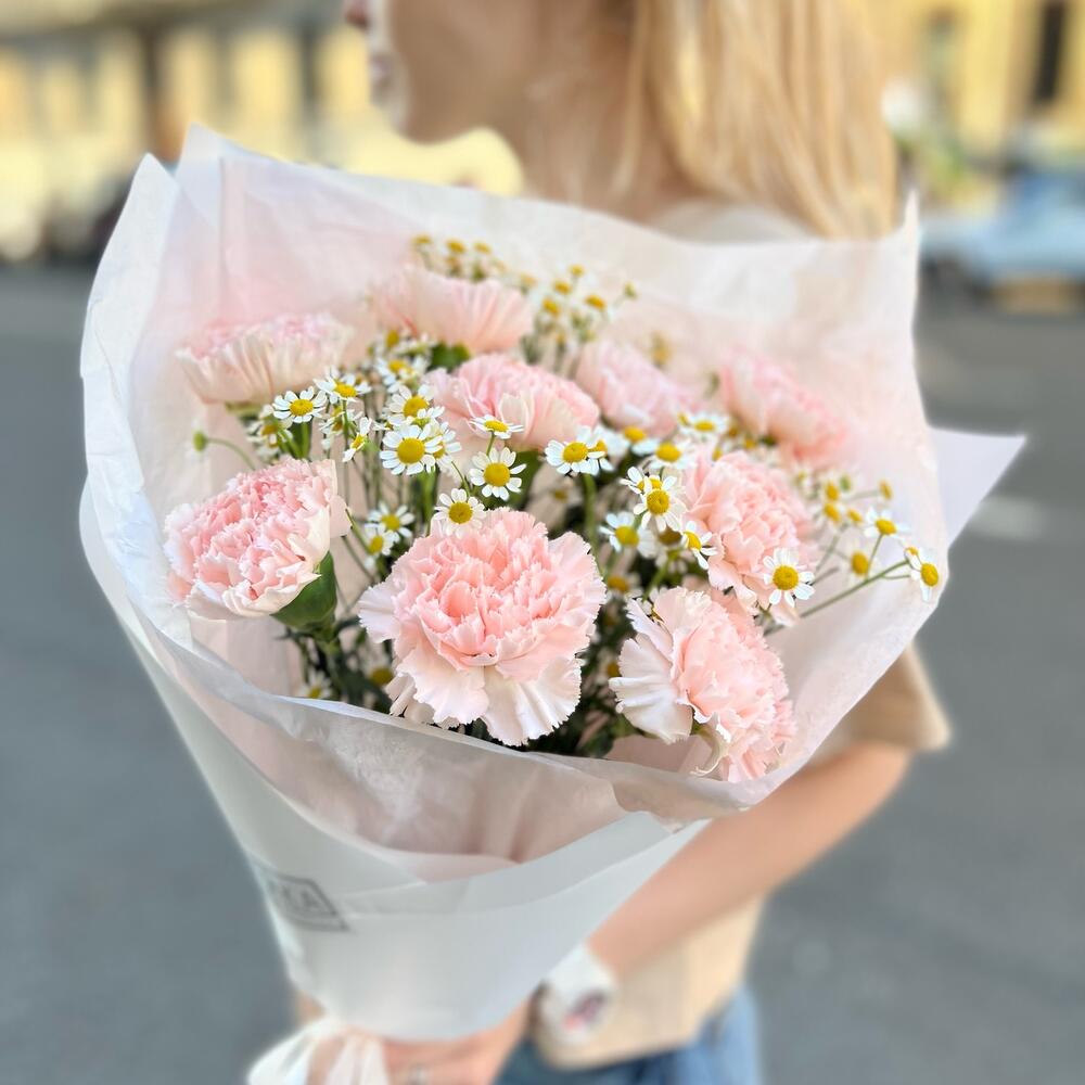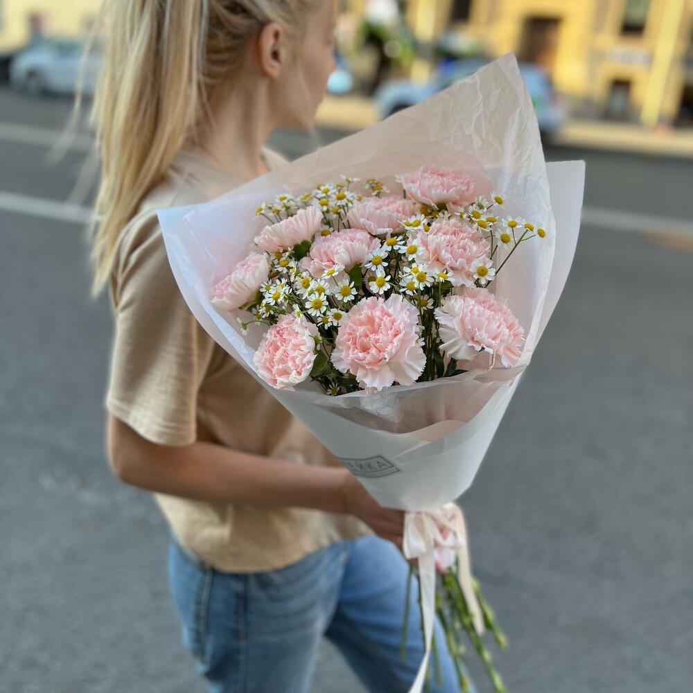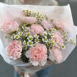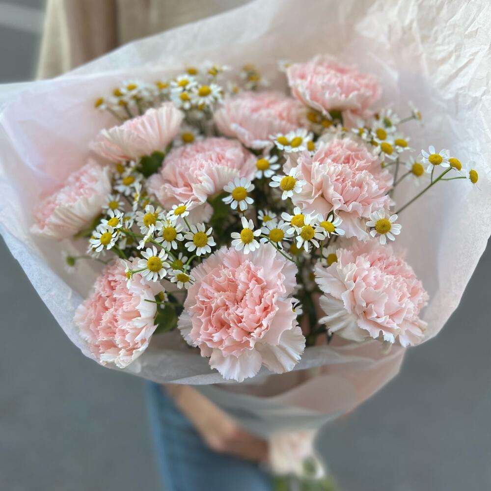 Лента атласная - 1 шт. Тишью - 1 шт. пленка матовая цветная - 1 шт. гвоздика сортовая (диантус) - 9 шт. матрикария (ромашка камилла) - 3 шт.