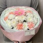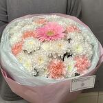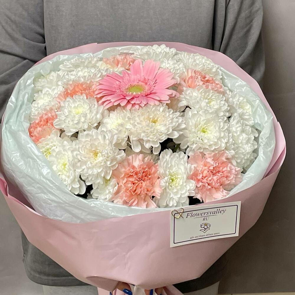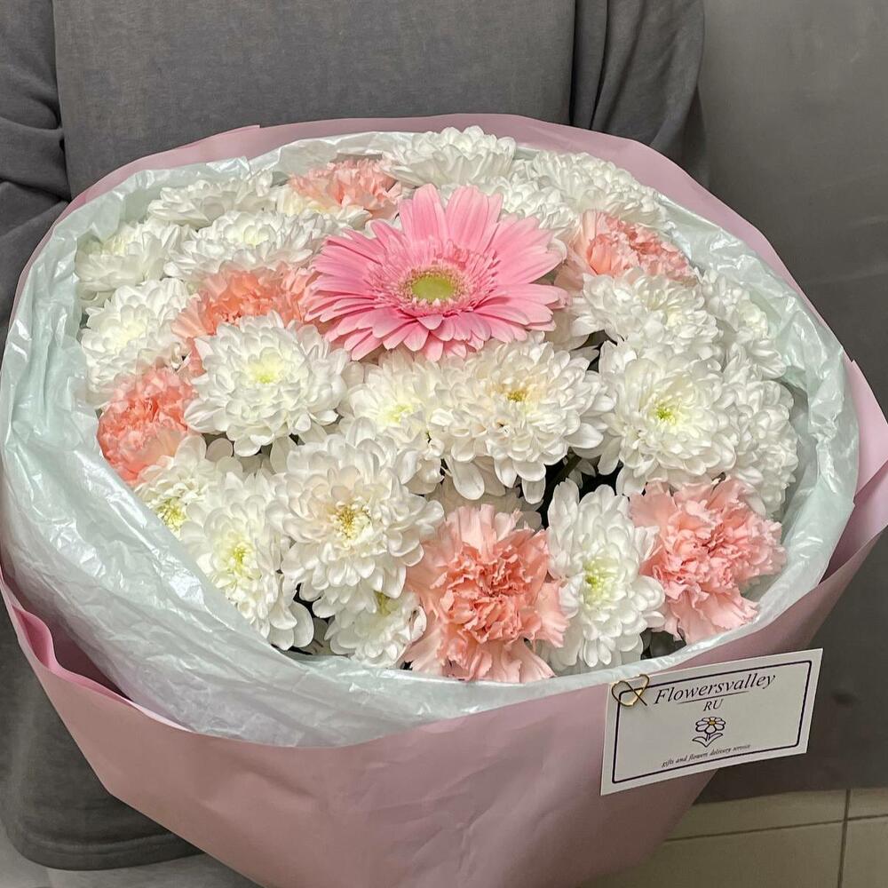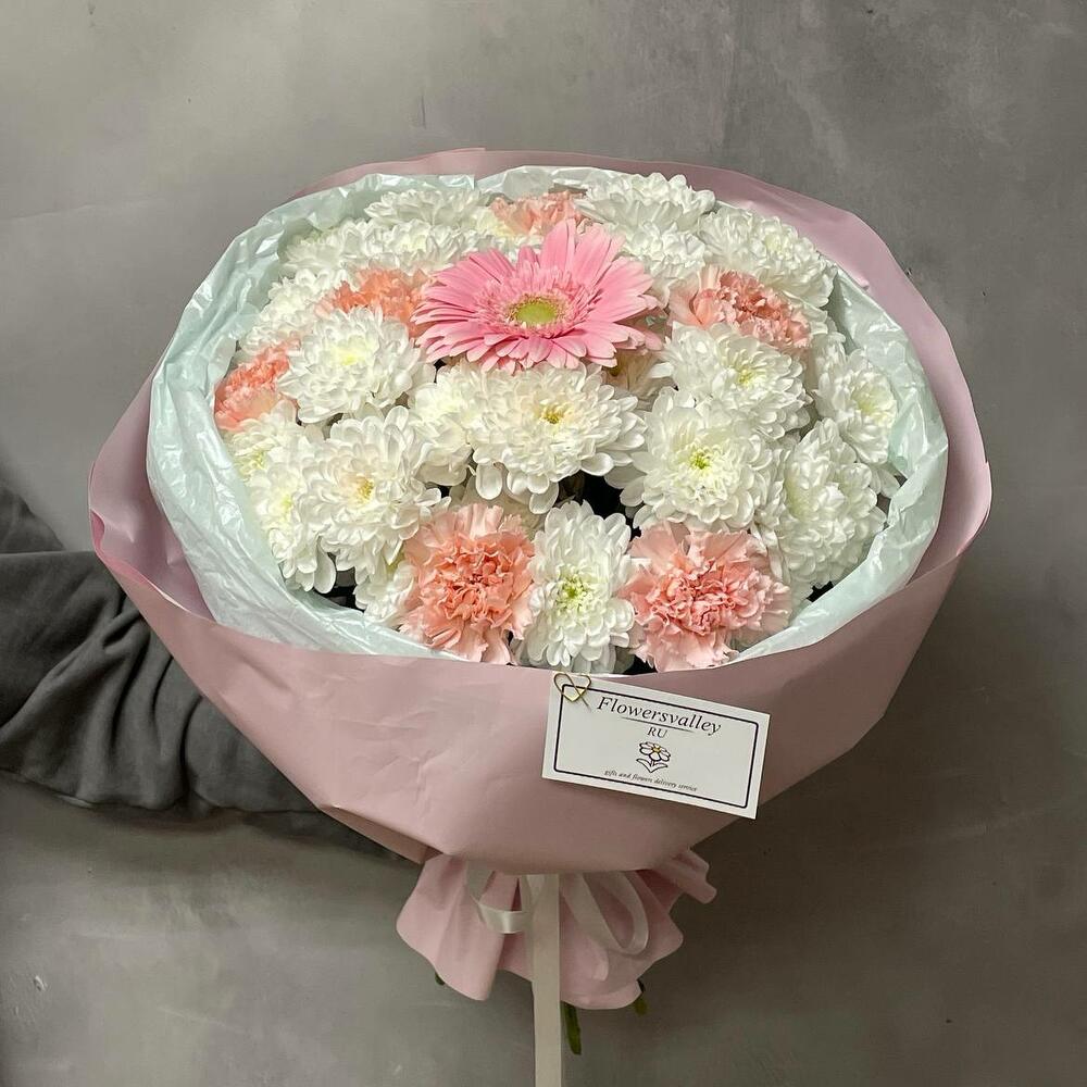 Красивый и роскошный букет, состоящий из герберы, хризантем и гвоздик. Розовая гербера имеет мягкий, нежный цвет и изящные формы, которые добавляют женственности и романтики к букету. Белые хризантемы и гвоздики имеют красивый цвет, который идеально дополняет розовую герберу, добавляя акцент в букет. В целом, этот букет будет идеальным выбором для девушки, маме или другу в день рождения, день святого Валентина или другой специальный праздник.