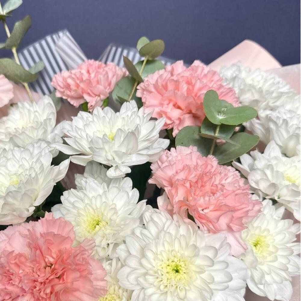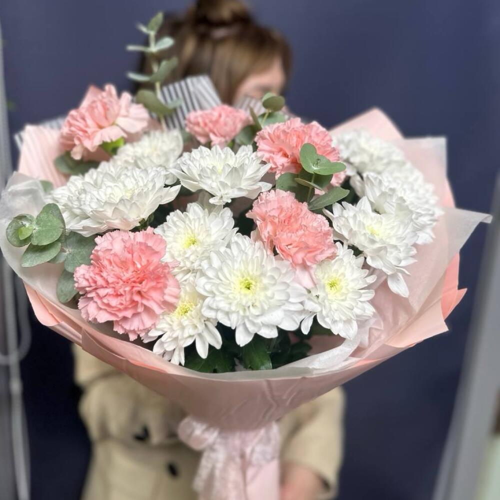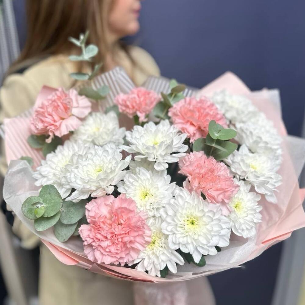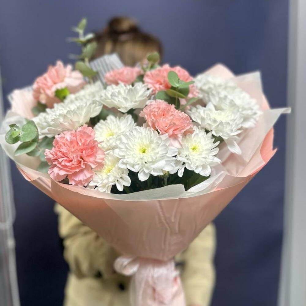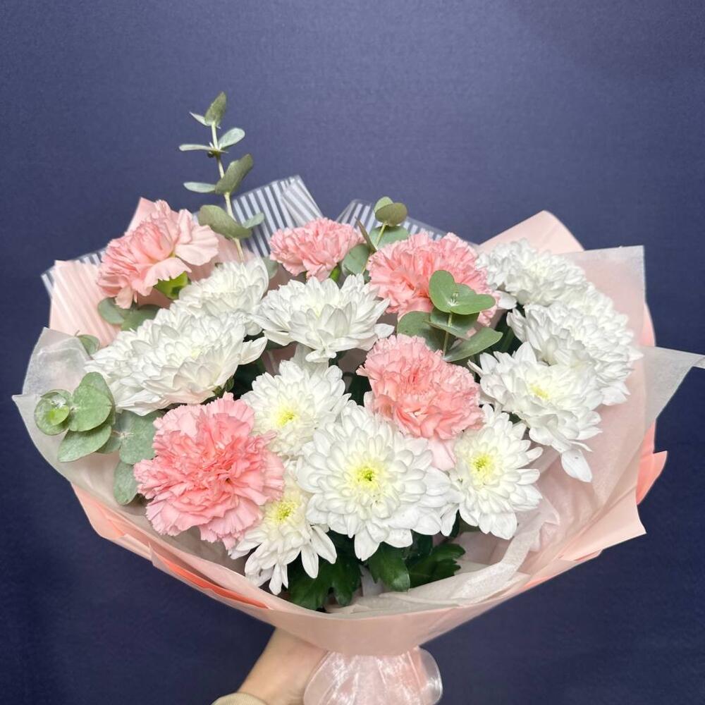 Букет из белых кустовых хризантем и розовых гвоздик. Этот букет — нежное воплощение изящной гармонии. Пышные шапки белых кустовых хризантем, похожие на кружевные облака, создают основу, наполняя композицию воздушным объемом и чистотой. Их дополняют трогательные розовые гвоздики, чьи бархатистые соцветия добавляют теплые, мягкие акценты. Их нежно-розовый оттенок, словно первый румянец зари, оживляет холодноватую белизну, создавая тонкую игру контрастов. Соединенные вместе, эти цветы дарят ощущение безмятежности, нежности и искренней, спокойной радости. Букет словно светится изнутри, излучая умиротворяющее и чарующее тепло. Маме, Букет для мамы