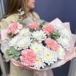 Хризантема кустовая - 3 шт. Эвкалипт - 2 шт. Гвоздика - 5 шт. Упаковка дизайнерская - 1 шт.