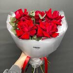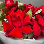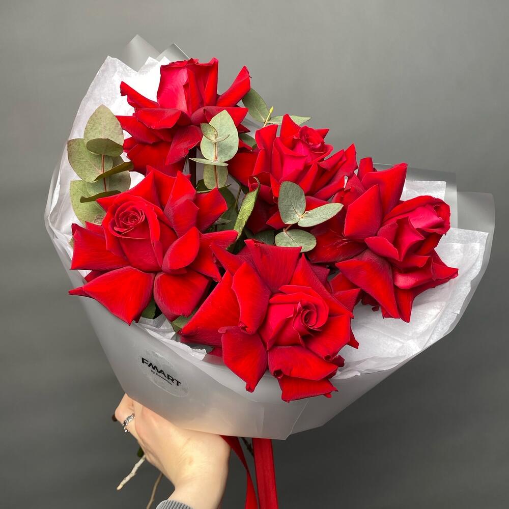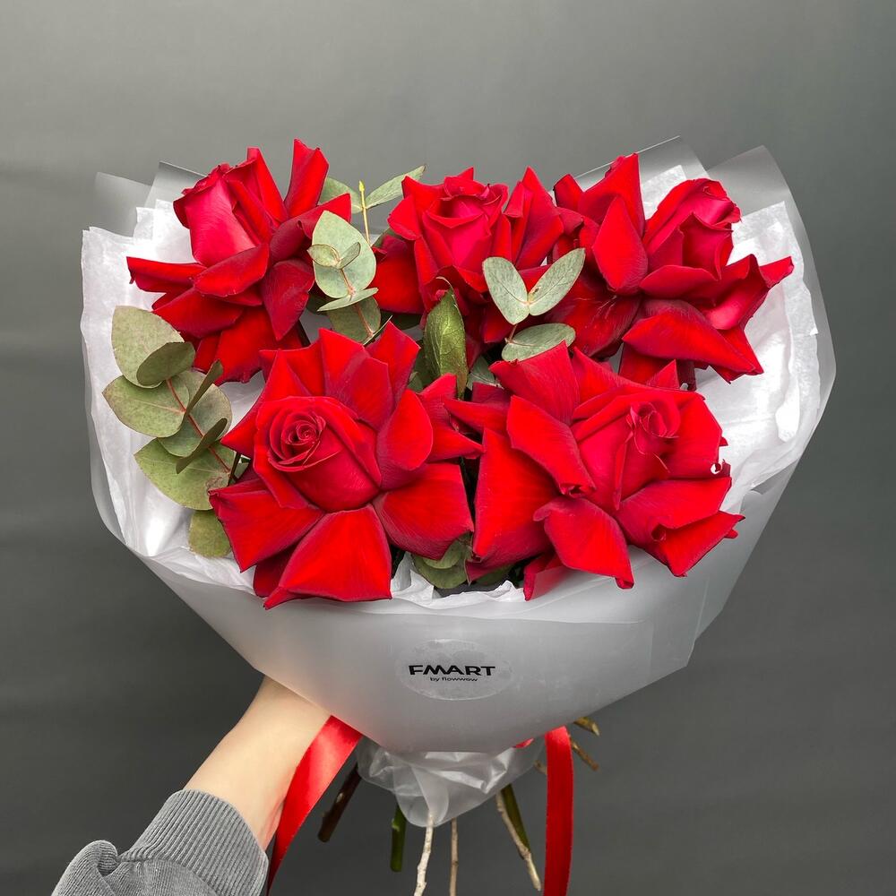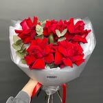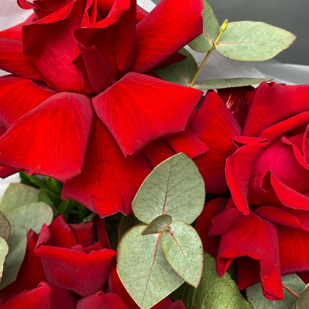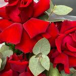 Букет из красных французских роз с эвкалиптом
