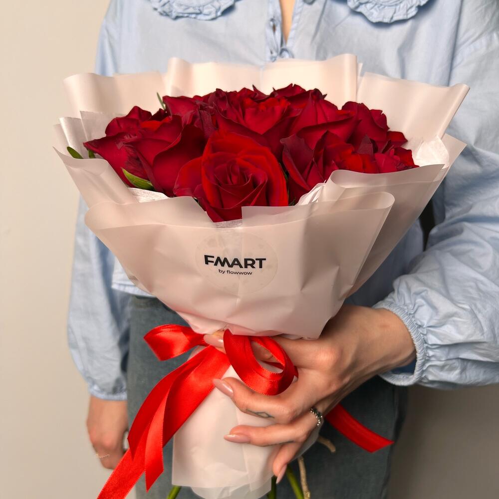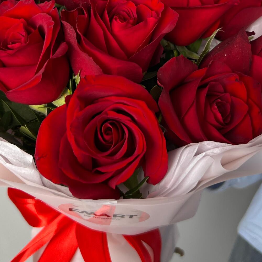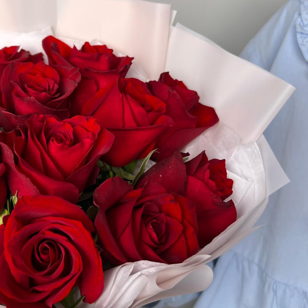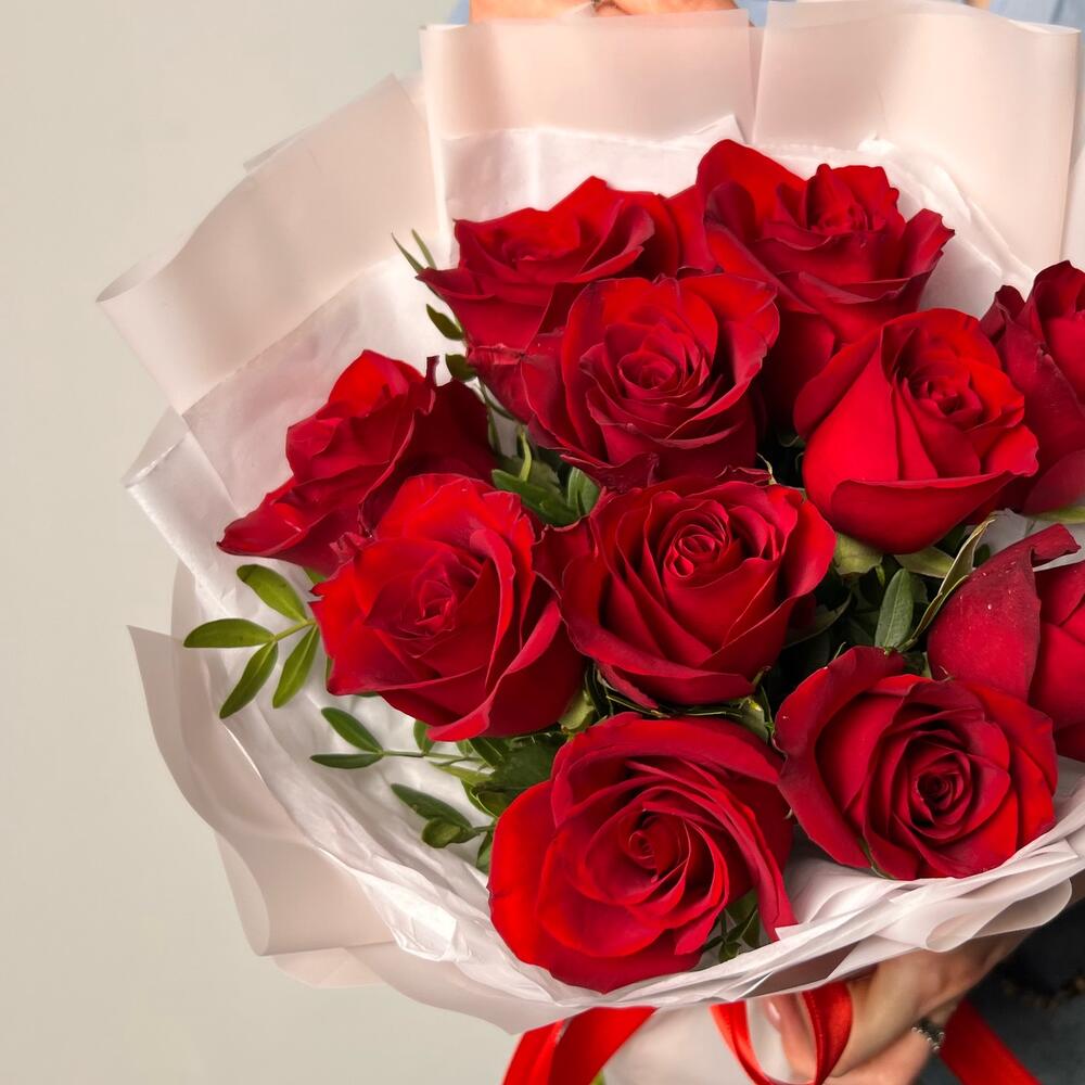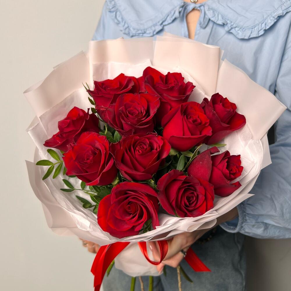 Упаковка - 1 шт. Лента атласная - 1 шт. Средство для продления жизни цветов - 1 шт. роза красная кения - 11 шт. инструкция по уходу за букетом - 1 шт. зелень писташ (пучок) - 1 шт.