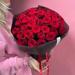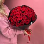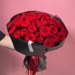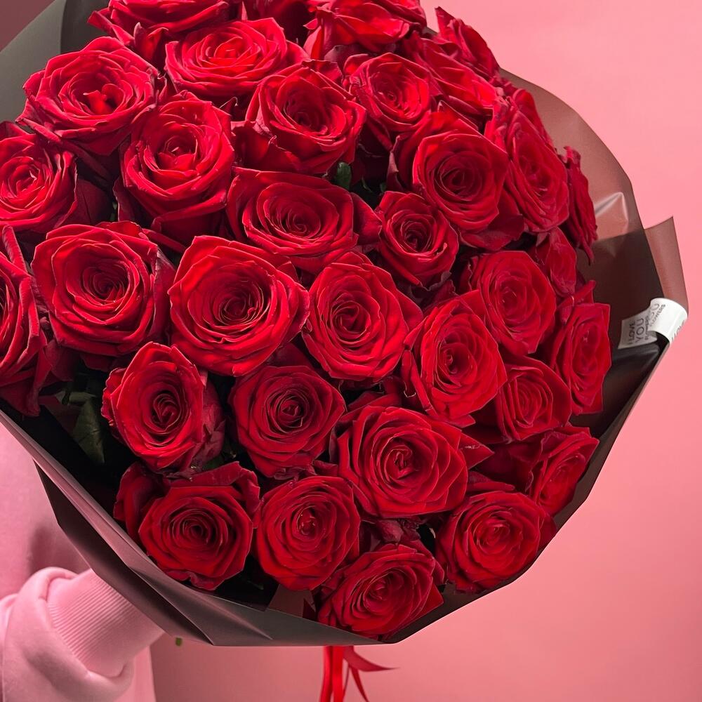 Упаковка - 2 шт. Лента атласная - 2 шт. Роза красная 50 см - 35 шт.